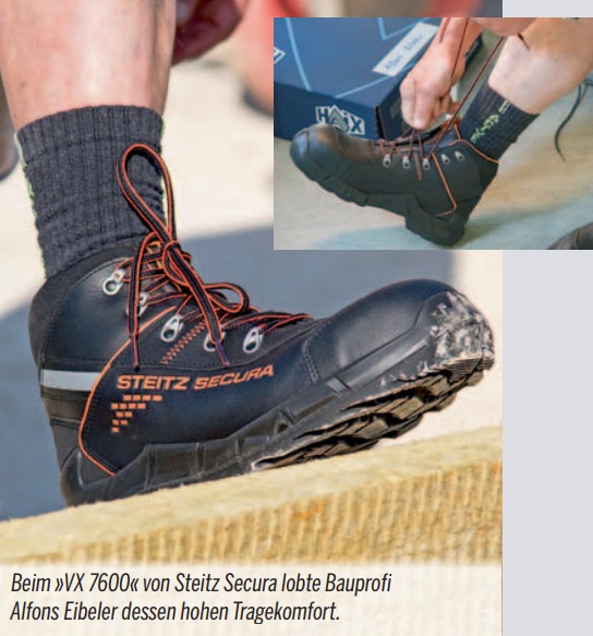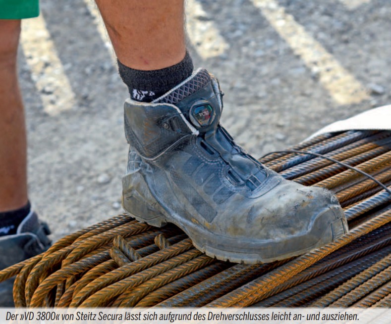 Ganz im Zeichen von Komfort und Flexibilität sollen wiederum die Sicherheitsschuhe von Steitz Secura stehen. Während sich Kranfahrer Alfons Eibeler ein Bild vom »VX 7600 PERB S3« machen durfte, probierte Facharbeiter Deniz Soyari den »VD 3800 B SST SF« aus. Letzterer ist mit dem speziellen Verschlusssystem »Boa Fit« ausgestattet, was dem Träger besonders gut gefallen hat: »Mit dem Drehverschluss sitzt der Schuh schnell an. Einfach drehen, fertig«, so Deniz Soyari.