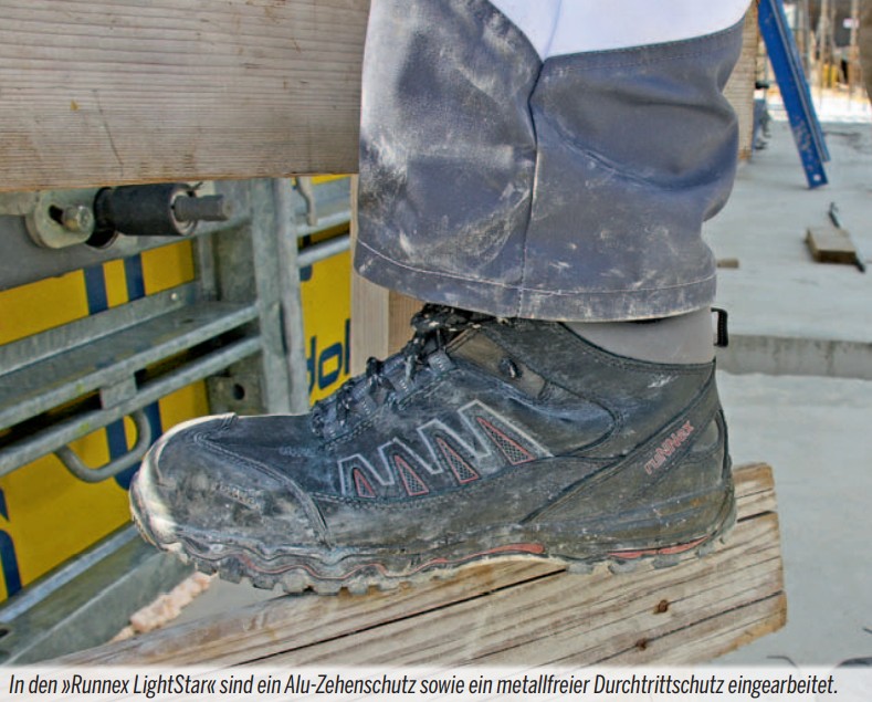 Beachtet werden muss hierbei die DGUV Regel 112-191: Sie schreibt vor, dass orthopädische Einlagen nur in Verbindung mit einer gültigen Baumusterprüfung in Sicherheitsschuhe eingelegt werden dürfen, damit diese weiterhin der Norm EN ISO 20345 entsprechen. Beim Thema Sicherheit setzt der Runnex-Schuh auf einen stoßfesten Alu-Zehenschutz sowie einen metallfreien Durchtrittschutz aus HAT-Keramikmaterial. »Zwar kann ich zur Schutzfunktion nichts sagen, weil in den acht Testwochen kein Unfall passiert ist, aber die Elemente wirken auf mich sehr hochwertig – sie fühlen sich ziemlich robust und sicher an.« Ein abschließend großes Lob sprach der Bauprofi beim »5310«er für Verarbeitung und Optik aus – in beiden Fällen wirke der Schuh sehr hochwertig und stimmig. »Man merkt halt, dass sich der Hersteller richtig was dabei gedacht hat.«