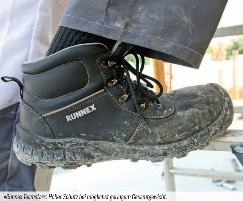 Zu guter Letzt haben sich unsere Bauprofis mit den Sicherheitsschuhen der Marke Runnex vom Hersteller BIG Arbeitsschutz auseinandergesetzt. Den Modellen »TeamStar 5310« und »LightStar 5321« hat Facharbeiter Mario Gutsfeld auf den Zahn gefühlt. Eine Gemeinsamkeit ist, dass sowohl die »TeamStar« -als auch die »LightStar«-Serie auf eine gute Balance zwischen reduziertem Gewicht und solider Schutzwirkung setzen. Zuerst probierte Mario Gutsfeld den »LightStar 5321« und damit einen Sicherheitsschuh, den er für seinen angenehmen Tragekomfort lobte. »Mir ist das Gewicht ziemlich wichtig. Gerade weil ich mit den Schuhen den ganzen Tag auf der Baustelle unterwegs bin, sollten die Füße so wenig wie möglich belastet werden. Je schwerer der Schuh ist, desto unangenehmer kann das dann auf Dauer werden.« Einen wesentlichen Beitrag zur Gewichtsreduzierung hat beim »LightStar« laut BIG die Verwendung von Aluminium-Schutzkappen geleistet. Die »Alu-Protection«-Zehenschutzkappe sei bedeutend leichter als massive Stahlausführungen, biete aber trotzdem eine hohe Stoßfestigkeit. Weitere Vorteile der Schutzkappe: Sie ist nicht magnetisch und korrosionsbeständig. Für gut befand der Facharbeiter außerdem den festen Halt: »Gerade wenn du auf Eisen und glatten Flächen läufst oder das Wetter nicht mitspielt, muss der Schuh rutschfest sein.« Verantwortlich dafür ist das spezielle Profil mit rutschhemmender Wirkung. Weitere Pluspunkte verteilte Mario Gutsfeld für das Design: »Mir gefällt der Aufbau des Schuhs und die Gesamtoptik – das wirkt alles sehr modern und trotzdem nicht verspielt.« Hinzu komme ein spürbar wertiges Obermaterial: Es besteht laut BIG aus hydrophobiertem Glattleder sowie einer TPU-Überkappe, wodurch der Schuh insgesamt robust und strapazierfähig bleibt.
