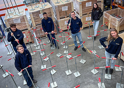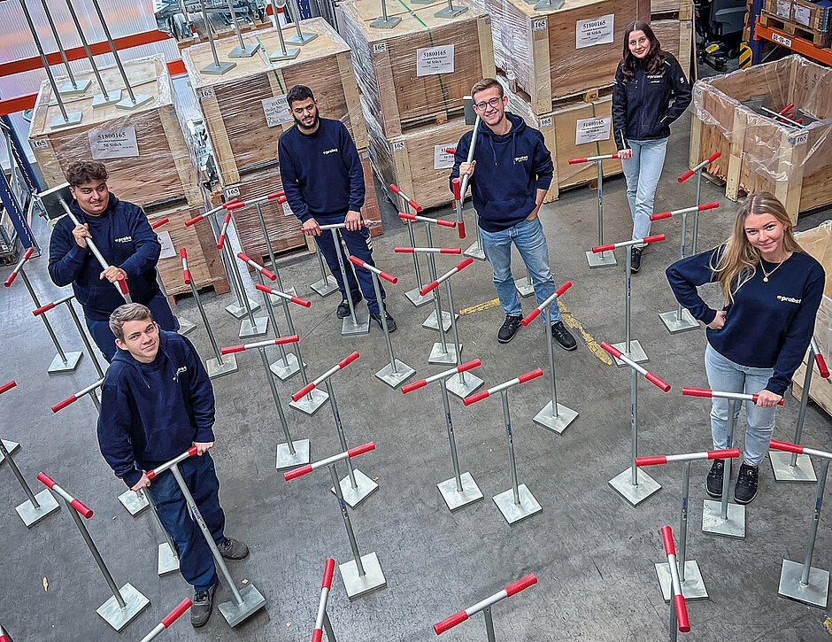 Der neue Stampfer ist ideal für das schnelle Verdichten kleinerer Oberflächen geeignet. Unverzichtbar, so der Hersteller, sei diese Lösung etwa im Garten- und Landschaftsbau, dort wo eine Rüttelplatte nicht eingesetzt werden kann. Im Januar 2023 wurde das Projekt »Bodenstampfer« gestartet. Das Ziel bei Probst war, ein internes Startup-Projekt in die Verantwortung des Nachwuchses zu geben. Jedes Jahr leiten die Auszubildenden ihr eigenes Projekt, unter anderem waren Nachhaltigkeitsthemen und eine komplexe Firmenpräsentation die Aufgaben. Dieses Jahr wurde ein Produkt neuentwickelt und machte die Auszubildenden zu echten »Intrapreneuren«. Mentor und Coach der Produktentwicklung ist Dr. Richard Gärtner, Leiter Entwicklung der Probst-Gruppe, der Wert darauf legte, dass dieses Projekt ganzheitlich nach dem gewohnten Prozess-Modell abgehandelt wurde. Sein Ziel war, den jungen Menschen einen möglichst großen Wissenstransfer aus der Praxis zu bieten. Mehrere Schulungen und Sitzungen wurden mit den Auszubildenden im Probst Showroom abgehalten.