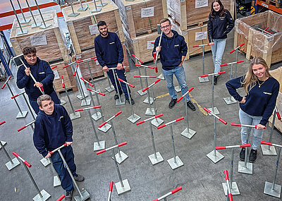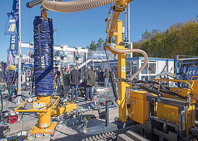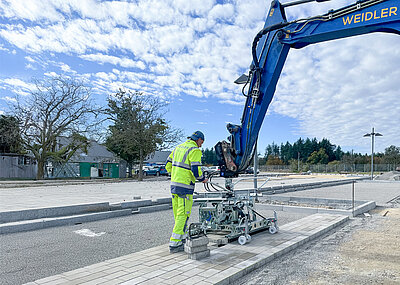 Durch das bewährte Wellenscheiben-Prinzip könne die Zange sowohl längs als auch quer zur Einstecktasche ausgerichtet werden. Im abgestellten Zustand liegt die Einstecktasche stabil auf einer Plattform der Zange auf, wodurch ein Umkippen verhindert wird. Um eine erhöhte Rutschhemmung zu gewährleisten, sind die Zinken-Aussparungen mit verschraubten Gummischienen versehen. »Mit der Zange haben wir das Kommissionieren von Blockstufen enorm vereinfacht. Der Fahrer kann alles direkt vom Stapler aus erledigen«, sagt Thomas Kegel, Fachberater GaLaBau im Westerhorstmann Bauzentrum.d