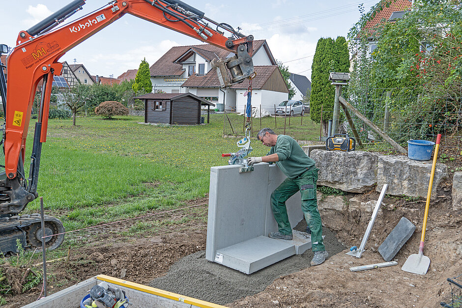 »Durch den Einsatz der WEZ-06 hängen die Mauerscheiben oder Winkelsteine gerade. Das Versetzen geht erkennbar einfacher von der Hand und schafft Zeitersparnis«, berichtet Marcus Hölz. Ein Schwerpunktausgleich an der Zange macht es möglich, dass das Element im Lot hängt und waagrecht abgesetzt werden kann. Aufwendiges Einfädeln eines Schlupfes in die Transportöse am Stein ist nicht notwendig, die Zange kann einfach auf den Stein aufgesetzt werden. Der GaLaBauer hebt hervor, »dass die Automatik zum Greifen und Absetzen besonders nützlich ist, da ein ständiges Ein- und Aussteigen aus dem Bagger bei einem 2-Mann-Trupp entfällt.«