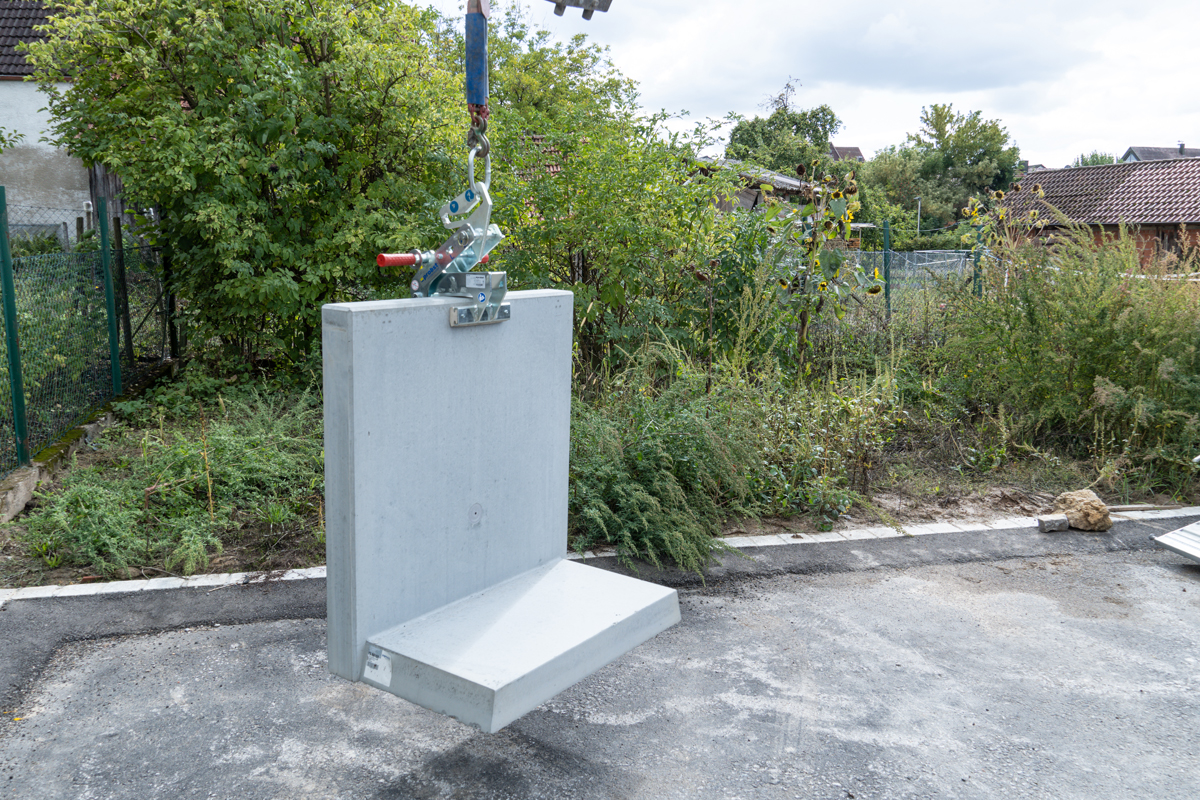 An einem Mehrfamilienhaus in Marbach am Neckar mussten Mauerscheiben versetzt werden, damit sollte eine Abgrenzung am Grundstück entstehen. Im Nachgang wurde die entstandene Innenfläche mit Terrassenplatten ausgelegt. Die Aufgabe für die Winkelelementzange von Probst: zugreifen und knapp 6 lfm Mauerscheiben mit einer Höhe von 1,05 m exakt zu setzen.