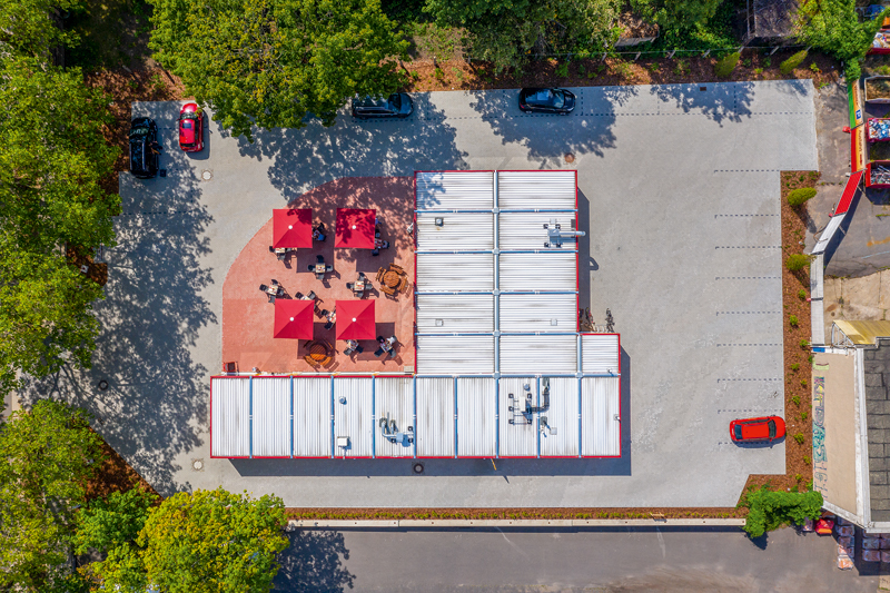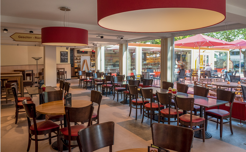 Im Schenkel des L-förmigen Grundrisses sind der Verkaufsraum mit Tresen und eine Zubereitungstheke untergebracht, im Hauptraum lädt das Café mit Sitzmöglichkeiten zum Verweilen ein. Personal- und Sanitärräume, Lager sowie der Technikraum für die Gastherme sind dem Gastraum angeschlossen. Im Gebäudewinkel ist eine Außenterrasse entstanden, die im Sommer das Platzangebot nach außen erweitert.