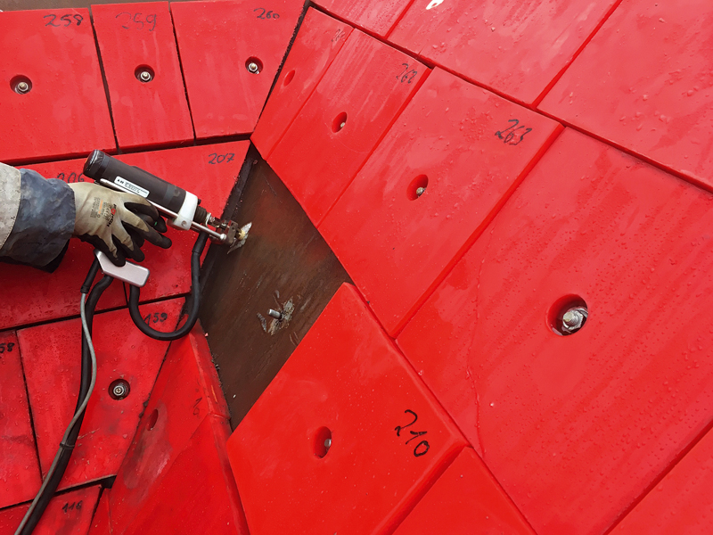Seit längerem ist Pucest protect mit den Modulen Tropf-PU am Markt und gibt den Nachhaltigkeitsgedanken weiter. So werden sich aus der Produktion ergebende Übermengen nicht entsorgt, sondern in dafür entwickelte Formen gegossen und ebenfalls für den Verschleißschutz eingesetzt. »Vielen Kunden ist es nicht bewusst, dass sie mit dem Einsatz unseres Tropf-PU bereits einen kleinen Beitrag in Sachen Nachhaltigkeit leisten«, betont denn auch Marco Bauer. Das Tropf-PU ist zwar nicht in den Größen der Standard-Verschleißschutzplatten lieferbar, lässt sich aber ebenso zur Dämmung der Lautstärke und als Aufprallschutz einsetzen. Selbst die einfache und schnelle Montage mit Schrauben oder Schweißbolzen ist gegeben sowie das leichte Austauschen einzelner, verschlissener Segmente. t