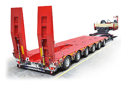 Ideal für den Bausektor ist der hydraulisch verbreiterbare MultiMAX-Semi-Tieflader. Erhöhte Sicherheit, verbesserter Komfort und deutlicher Zeitgewinn sind die drei Trümpfe, die diese Option auszeichnen. »Die beidseitige Verbreiterung lässt sich per Fernbedienung stufenlos ausfahren und passgenau der Maschinenbreite des Ladevolumens angleichen (auf maximal 3,2 m)«, umschreibt der Produktverantwortliche die Flexibilität.