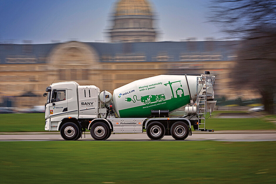 Putzmeister und Holcim testeten gemeinsam, ob der batterieelektrische Fahrmischer in der Praxis hält, was er an Effizienz verspricht. Mit einer Batteriekapazität von 350 kW/h sollte in städtischen Einsatzgebieten ein Arbeitszeitfenster von ungefähr acht Stunden erreicht werden. 4 462 km hat der eMischer in Paris bereits zurückgelegt. Mit einer durchschnittlichen Fahrstrecke von der Mischanlage zur Baustelle von 5,4 km, die mit 5,6 m³ Beton an Bord im Schnitt in rund 20 Minuten zurückgelegt wurde, konnten genügend Touren gefahren werden, um den eMischer effizient einzusetzen. Die Besonderheit liegt im Antrieb: Der eMischer basiert auf einem Sany-Elektrofahrgestell und wird zu 100 % elektrisch angetrieben. Damit entstehen während des gesamten Betriebs keine CO²-Emissionen. Auch der Schallpegel ist durch den E-Antrieb geringer.d