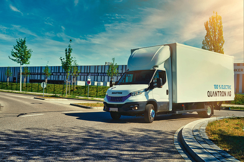 Mit der Technik von AE Driven Solutions (AEDS) realisiert Quantron Wasserstoffantriebslösungen für Transporter ab 3,49 t. Bei einem Fahrzeug mit Wasserstoff-Antrieb entsteht in der Brennstoffzelle durch die elektrochemische Reaktion von Wasserstoff und Sauerstoff elektrischer Strom, der als »Range Extender« zum Laden der Antriebsbatterie eingesetzt wird. Im Rahmen der Reaktion in der Brennstoffzelle entsteht nur Wasserdampf, der dann beim Fahren abgegeben wird. Hinzu kommen die allgemeinen Vorteile eines e-Fahrzeugs, auch Wasserstofffahrzeuge genießen die Steuer- und Mautbefreiung sowie geringere Wartungs- und Betriebskosten als Fahrzeuge mit Diesel-Antrieb. Auf Basis des Iveco Daily will Quantron beispielsweise Fahrzeuge mit 4,2 t und 100 kW Leistung sowie 7,2 t und 147 kW Leistung anbieten, die entsprechend der gewählten Tankgröße über Reichweiten von 300 km bis 500 km verfügen. Am Ausbau der Produktreihe für Transporter mit Brennstoffzelle wird nach Anbieterangaben gearbeitet, um künftig auch Wasserstofffahrzeuge mit unterschiedlichen Aufbauten sowie weitere Modelle anderer Hersteller anbieten zu können. t