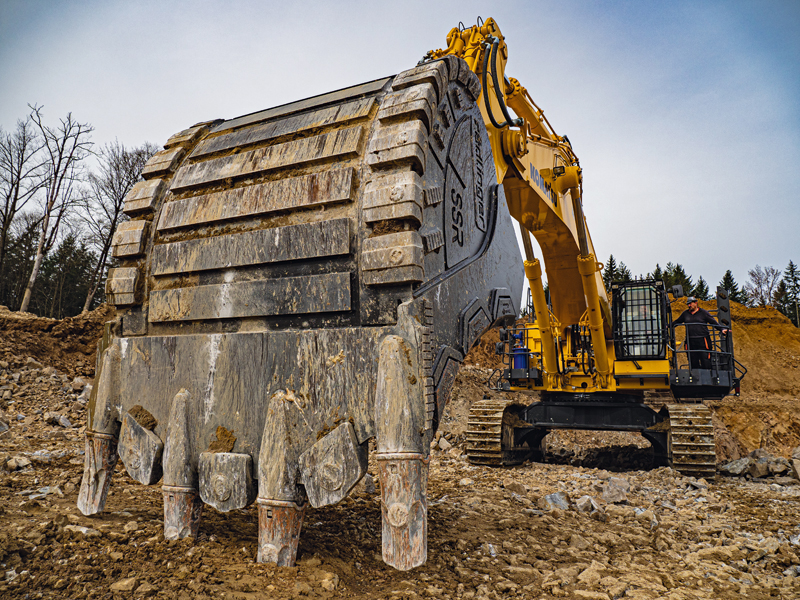 Rund 10 t Gesamtgewicht, 2,4 m Schnittbreite, 7,5 m³ Inhalt und rundherum gepanzert – ein »Tieflöffelriese« hat kürzlich die Fertigungshallen von Rädlinger Maschinen- und Stahlbau verlassen. In einem Steinbruch von SSR Mineralgestein wird er künftig an einem 120 t schweren Komatsu PC 1250 abgesprengte Granitblöcke verladen.