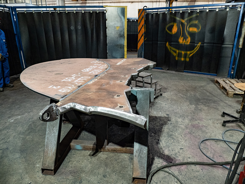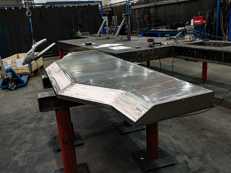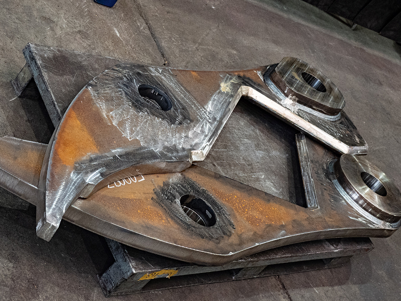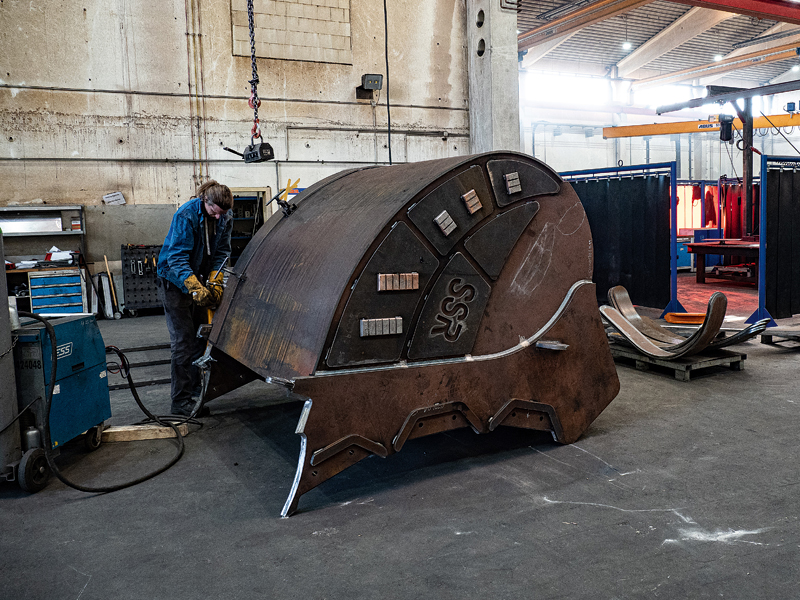 Nach Abnahme der Freigabezeichnung durch den Kunden und den Baumaschinenhändler begann die Fertigung in Windischbergerdorf: Aus Stahlplatten wurden die Einzelteile geschnitten, in Form gebracht, geheftet, geschweißt – bis nach wenigen Wochen der fertige Löffel lackiert und verschickt werden konnte. t