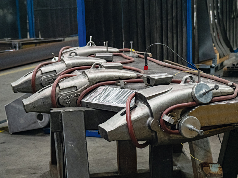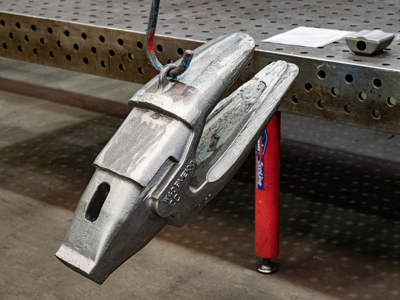 Im Fall des Tieflöffels für SSR Mineralgestein zeigte sich vor Ort, dass im Steinbruch stark abrasiver Quarzsand vorhanden ist, der die Oberfläche angreift. Entsprechend musste der Löffel mit deutlich stärkerer Panzerung konstruiert werden als sonst für Einsätze in Steinbrüchen notwendig wäre. Verschleißstreifen innen und außen aus HB450 und HB500, Seitenschneiden aus Hardox mit zusätzlichen Combi Wear Pro Claws Side Shrouds und Heel Shrouds – der Löffel ist an jeder dem Verschleiß ausgesetzten Stelle verstärkt. Dank des Ortstermins konnten die Anforderungen bereits bei der Angebotsabgabe berücksichtigt und somit spätere Kosten vermieden werden.