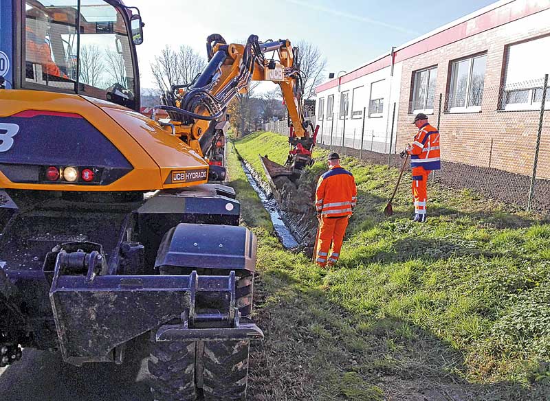 Auf diese Weise konnten die Arbeiten entlang einer Kreisstraße ohne größere Einschränkungen für den Verkehr abgewickelt werden. Thomas Goldhausen ist Geschäftsführer des Unternehmens, das auch in den Bereichen Rohstoffhandel, Transporte und Speditionsdienste tätig ist. Mit der Empfehlung seines Händlers JCB-Vertrieb + Service Frechen ist er sehr zufrieden: »Angebaut an unseren JCB Hydradig 110 W lassen sich mit dem Grabentrapezlöffel gleich mehrere Arbeitsschritte auf einmal durchführen: Ausheben, Abziehen, Bereinigen. Damit können wir bei unseren Kunden punkten.«