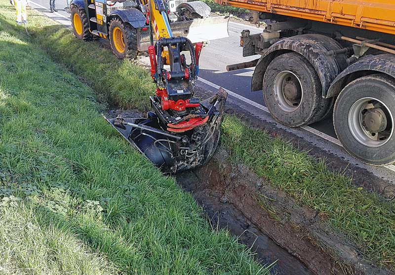 Auch Forstbetriebe, Straßenmeistereien und Bauhöfe schätzen die einfache, präzise und effiziente Durchführung von Grabenarbeiten mit dem Spezialwerkzeug. Die Reinigung und der Erhalt von Gräben zur Ableitung des Oberflächenwassers spielt nicht nur entlang von Straßen eine wichtige Rolle. Auch an Schotter- und Waldwegen ist ihre Pflege zum Schutz vor Erosion und Frostschäden durch nicht oder unkontrolliert ablaufendes Wasser relevant. Boden, Laub, Gehölz oder auch Unrat lassen sich zusammentragen oder abfahren; anders als bei der Säuberung mit einer auch aus Sicht des Naturschutzes nicht unbedenklichen Fräse, wo das Material in der Umgebung landet.