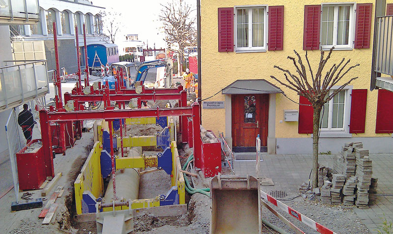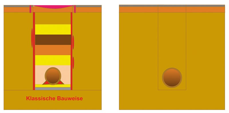 Seit man im 19. Jahrhundert begann, in den deutschen Städten die Kanalisation zu bauen, war es üblich, die empfindlichen Rohre in einem Sandbett zu verlegen. Bei größeren Rohrdurchmessern werden diese auch schon mal auf Beton verlegt oder ganz mit Beton ummantelt, wobei ein in Trassenrichtung starrer Körper entsteht, der bei jeder noch so kleinen Setzung mit den entsprechenden Folgen brechen kann. Anschließend wird der Graben mit Kiessand verfüllt, den man benötigt, damit man den Verfüllbereich in der herkömmlichen Technologie verdichten kann.
