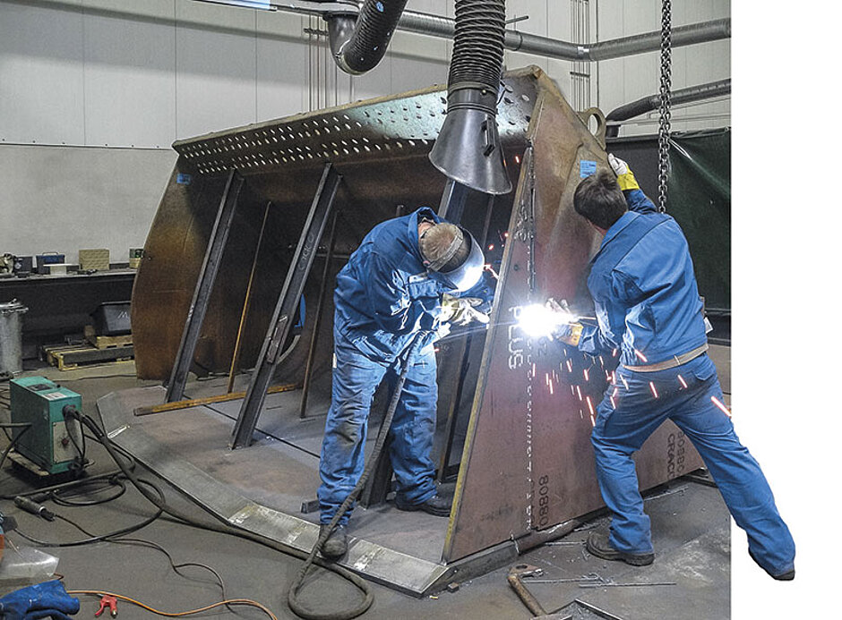 Um den Eindringwiderstand im Ladespiel zu minimieren, wurden die Schneidengeometrie und der Faswinkel des Deltamessers auf das Ladegut abgestimmt. Anschließend werden die Bauteile fachgerecht mittels MAG-Schweißverfahren in den noch bestehenden Schaufelkörper eingebaut. Durch Materialanalyse und Streckgrenzenbestimmung wird der zu verwendende Schweißdraht ermittelt. Die Bauteile werden sachgemäß nach DIN 5817C (Qualitätssicherung) mit HV- und mehrlagigen Kehlnähten mit dem Schaufelgrundkörper verschweißt.