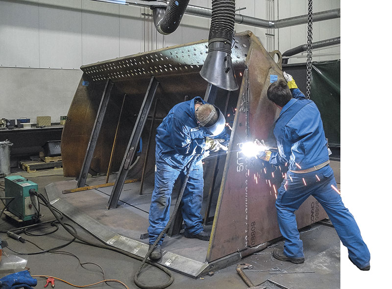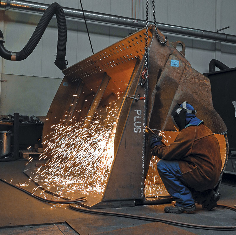 Mit Cracox fand auch die Firma Knuth Transporte aus Seevetal bei Hamburg eine optimale Lösung für die Ladeschaufel des eigenen CAT 988. Der Logistikdienstleister von Schüttgütern aller Art ist besonders im Bereich der Eisenschlacke aktiv, ein Material, das durch sein enorm hohes Schüttgewicht extrem abrasiv ist. Eisenschlacke wird vorzugsweise im Straßen- und Tiefbau eingesetzt. Die durch den Einsatz mit der Schlacke äußerst verschlissene Schaufel war nicht mehr einsatzfähig. Nach eingehender Beratung durch einen Außendienstmitarbeiter der Firma CRACO entschied sich Knuth Transporte für eine Reparatur.Verwendete Stahlsorten und die Konstruktionsverbesserungen wurden gemeinsam mit dem Kunden auf den Arbeitseinsatz abgestimmt. Das ist nicht nur eine Preisfrage, denn wenn eine Regenerierung fachmännisch und sorgfältig durchgeführt werden soll, dann kann das Ergebnis, wie CRACO unterstreicht, sogar oft besser als das Neuprodukt sein. Im Fall des extrem abrasiven Verschleißes durch die Schlacke und deren enormes Eigengewicht wurde eine für die Verschleißsituation optimale Lösung aus dem Verschleißstahl Cracox entwickelt. Die verschlissenen Seitenschneiden, der komplette Schaufelboden, der gleichzeitig den Rücken der Schaufel bildet inklusive Verschleißplatten und das verschlissene Deltamesser werden von einem nach DIN EN 287-1 geprüften Schweißer im Werk per Brennschneidverfahren herausgetrennt.Zeitgleich werden auf modernen Brenntischen die Teile passgenau aus Cracox-Plus-Tafeln geschnitten und der neue, 4 m lange Boden/Rücken in einem Stück aus 20 mm dickem Cracox 400 gewalzt. Hier entschied man sich für den etwas zäheren Verschleißstahl, da es sich beim Boden um ein tragendes Element handelt. Er muss dynamischen Beanspruchungen standhalten, ohne zu reißen. Da der Boden in einem Stück auf gesamter Länge gewalzt wurde, sorgt das neue dicke Blech für höchste Stabilität.