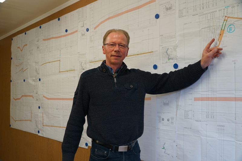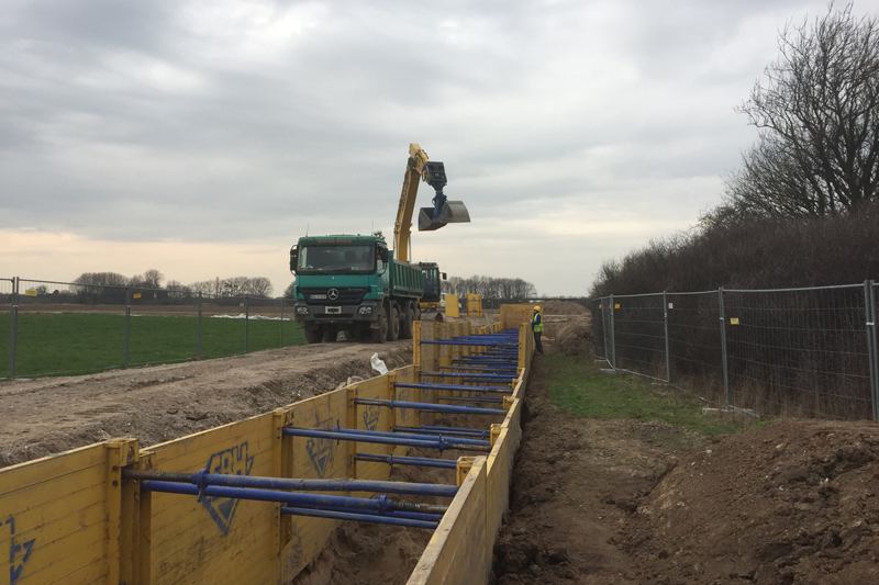 Im Herbst 2016 hat die Reinhard Rohrbau GmbH mit der Vorbereitung des Baufeldes begonnen. Das erste von drei Baulosen führt von der Bruchstraße bis zur Dr.-Detlev-Karsten-Rohwedder-Straße in Asterlagen und verläuft über Wirtschaftswege, Felder und Grünland. Die Verlegung der Leitung erfolgt in offener Bauweise. „Aufgrund des beengten Baufeldes von ca. 6 m Breite sind diverse anspruchsvolle technische und ökologische Anforderungen zu erfüllen“, erklärt Dipl.-Ing. Hans-Jürgen Nielsen, Geschäftsführer EVN Ingenieurgesellschaft mbH, Flensburg, die von der FVN mit der Planung und Bauüberwachung der Maßnahme beauftragt wurde. „Neben der Sicherung der Baugrube und des Baufeldes betreffen diese unter anderem den Schutz der Natur entlang der Trasse.“ Bereits im Vorfeld wurde ein Landschaftspflegerischer Begleitplan erstellt, der die Eingriffe in Natur und Landschaft darstellt und die Kompensation ermittelt. Der erforderliche Einschlag von Wald- und Gehölzflächen wird darin auf ein Minimum reduziert. „Zudem muss das ausführende Unternehmen in besonders schützenswerten Bereichen eine Baustraße einrichten, um den Baugrund bei der Befahrung durch Bagger und Lkw möglichst zu schonen“, ergänzt Dipl.-Ing. Uwe Burrichter, Geschäftsführer der Reinhard Rohrbau GmbH. Die Baustraßen werden unmittelbar auf der vorhandenen Geländeoberfläche angelegt. Zur Reduzierung des Flächenverbrauchs für zusätzliche Bodenlagerungsflächen sowie zum Schutz des natürlichen Bodengefüges wird in diesen Bereichen auf einen Abtrag des humosen Oberbodens verzichtet. Zur Trennung wird zunächst ein Vlies / Geotextil ausgelegt und dann die Baustraße aus einer mineralischen Schüttung aufgebracht. Die Mächtigkeit der Schüttung beträgt nach der Verdichtung im Bereich schützenswerter Böden und landwirtschaftlicher Nutzflächen 0,60 m. Die Regelbreite der Baustraßen und Fahrspuren beträgt 3 m.