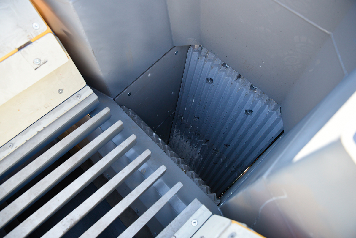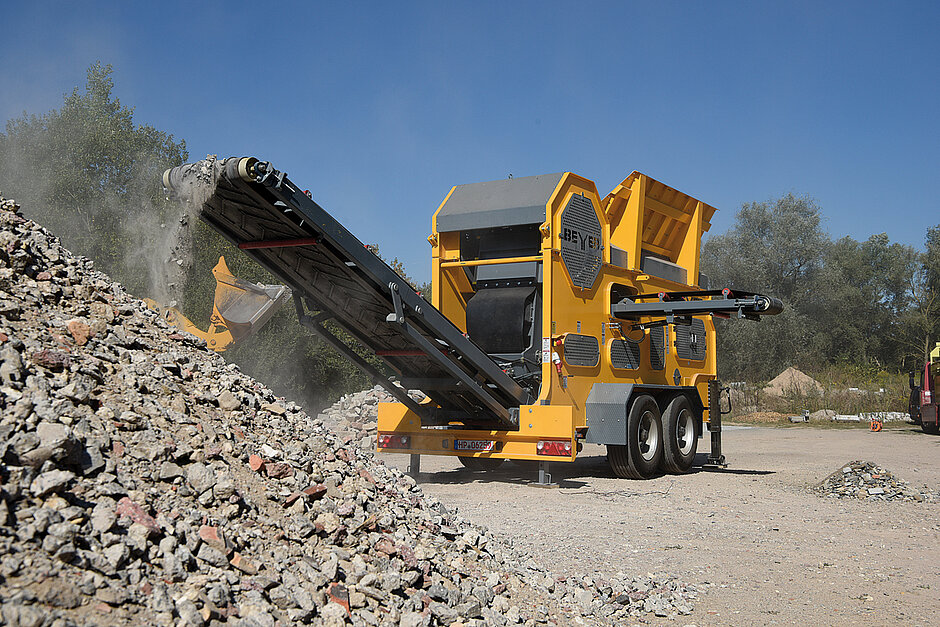 Das Brechgut wird beim KB700 über eine automatische lastabhängige Vibrorinne mit integrierter Vorabsiebung in den Brecherkörper transportiert. Über eine hydraulische Spaltweitenregulierung lässt sich die Maulweite im Brecherkörper zwischen 40 mm und 80 mm auch im laufenden Betrieb steuern. Die Brechplatten aus hochverschleißfestem Manganguss lassen sich laut Anbieter aus dem südhessischen Viernheim im Stillstand der Maschine bis auf 80 mm hydraulisch öffnen. Der Materialaustrag von Vorabsiebung und Brechgut erfolgt über Förderbänder, die mit Überbandmagneten nachgerüstet werden können und ebenfalls hydraulisch am Brecher ein- und ausklappbar sind.