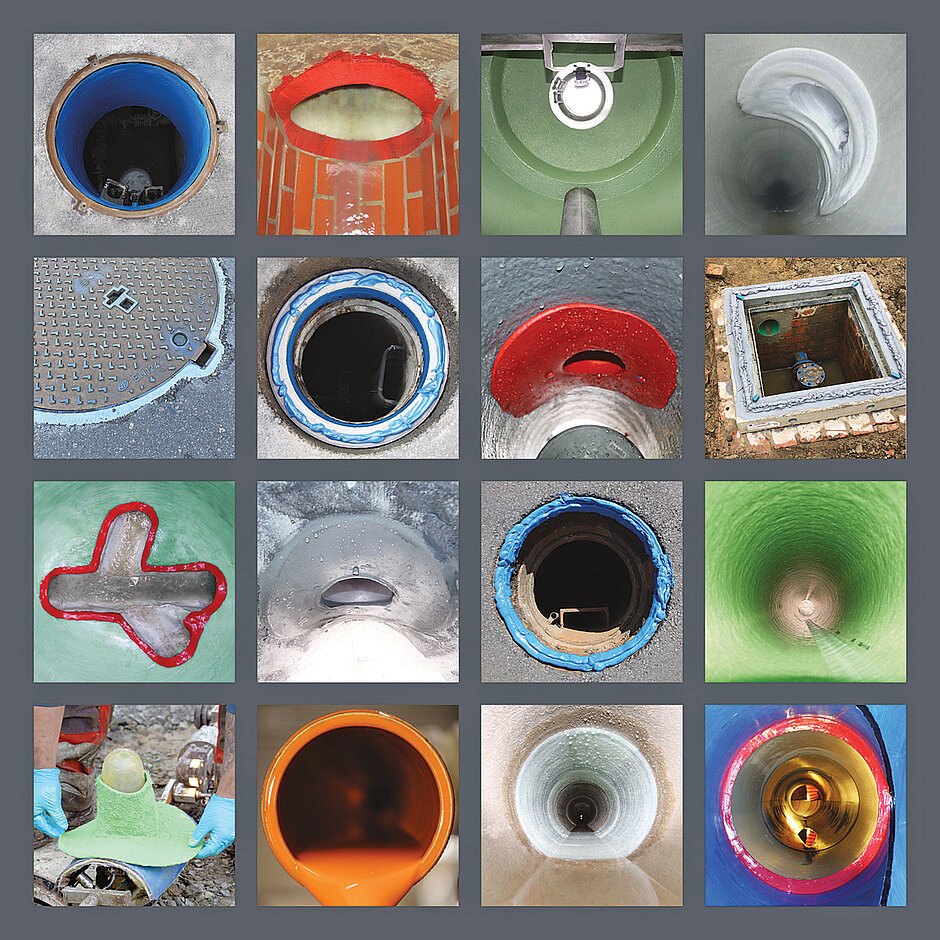 Mit Harz4 sanierte Stutzen fügen sich stimmig in die Abwasserhaltungen ein. Speziell für die Schalungsroboter von ProKasro entwickelt, macht das Traditionsharz der resinnovation wieder zuverlässig dicht. Ebenfalls in Grau treten resiTwin EP und resiTwin EP thix auf den Plan. Durch die zurückhaltende Farbgebung fügen sie sich im Bereich des Straßenbaus gut ins Bild ein und fallen nur dadurch auf, dass etwas wegfällt: Lärm für die Anwohner und Holperfallen für die Verkehrsteilnehmer. Im praktischen Kartuschensystem lassen sich Harz und Härter leicht und sicher mischen und einfach anwenden. Wenn abgesunkene Schachtabdeckungen mit den dauerflexiblen Harzen im Flüsterkappenverfahren wieder auf Straßenniveau gebracht werden, fallen die Fahrzeuge beim Überfahren nicht mehr auf die Deckel herab und die Anwohner haben wieder Ruhe.