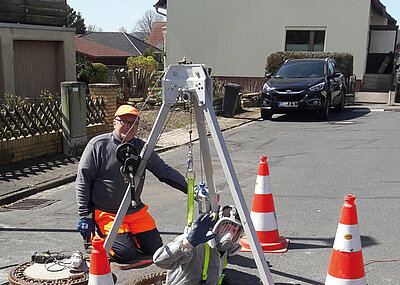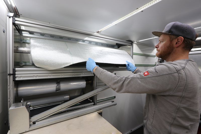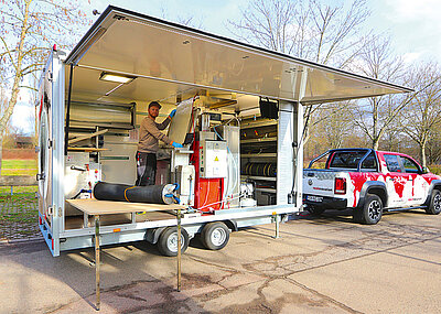 E-Packer in unterschiedlichen Dimensionen und Längen liegen an der Stirnseite des Sanierungsanhängers sicher und übersichtlich in einem Metallregal – hier findet auch der Gerinnelinerpacker seinen Platz. Der Tisch kommt wieder zum Einsatz, um die Matte fertigzustellen und auf den E-Packer aufzuwickeln. Dieser wird mit Strom- und Druckluft-Kabel – beide auf stabilen Kabeltrommeln am Heck des Sanierungsanhängers verwahrt - verbunden und an die Schadstelle eingebracht.