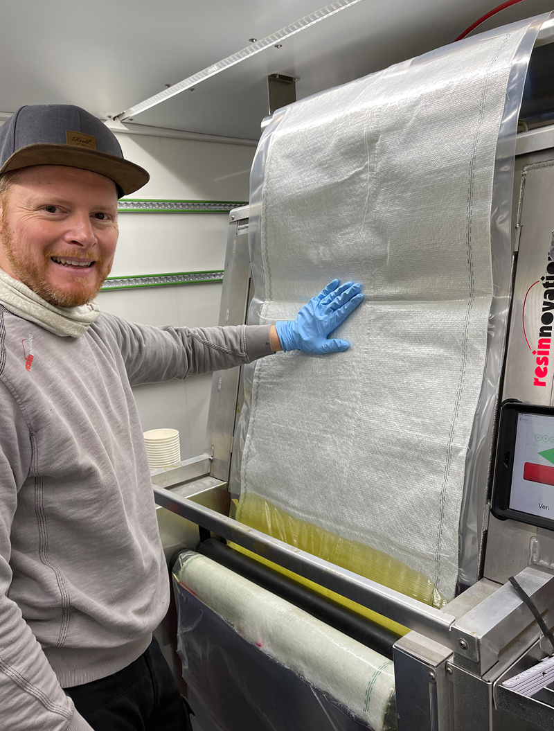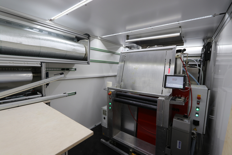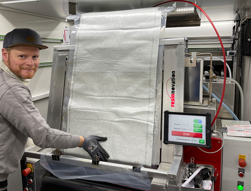 Während des Tränkens und Kalibrierens auf dem Vakuum-Imprägnierer unterstützt ein Fach, an der Decke des Sanierungsanhängers bei der Führung von längeren Glasfasermatten – etwa für einen 1,20 m langen PARTLINER oder einen Gerinneliner. Die Dosiertechnik, die direkt hinter dem Vakuum-Imprägnierer steht, misst die von der App berechnete Harz- und Härtermenge ab, und der Anwender bringt das luftfrei gemischte PARTLINER-Harz über einen Mischkopf mit Zwangsmischer direkt in den Folienschlauch auf die Glasfasermatte auf. Nach dem Mischvorgang steuert die App nun den Imprägnier- und Kalibriervorgang genauestens – die Glasfasermatte wird rasch, sicher und sauber luftfrei getränkt und exakt kalibriert - und das bei jedem neuen PARTLINER in stets reproduzierbarer Qualität.