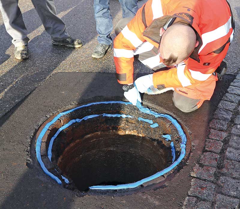 Im aktuellen Anwendungsfall musste FlexyPox keinen Höhenversatz ausgleichen, sondern nur die Schachtabdeckung fest mit dem Asphalt verkleben. Deshalb reichten zwei flache Ringe aus Harz jeweils auf der oberen und unteren Auflagefläche für die Abdeckung. Direkt nach dem Auftrag des Harzes wurde die Schachtabdeckung wieder passgenau eingelegt und sorgfältig auf Fahrbahnniveau gebracht. Im Sommer könnte die Schachtabdeckung durch die rasche Ausformzeit des Epoxidharzes bereits nach etwa zwei Stunden wieder für den Verkehr freigegeben werden. Da die Temperaturen zum Zeitpunkt der Sanierung aber nur bei etwa 7 °C lagen, blieben die Warnbaken über Nacht auf den Schachtabdeckungen stehen. §