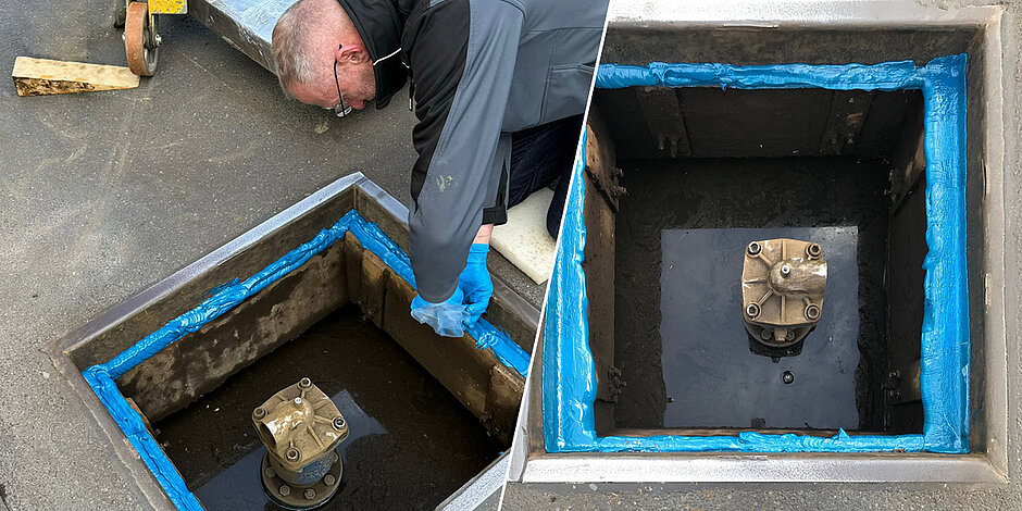 Inmitten dieser Herausforderungen setzt die Mainfrankennetz GmbH nun auf »FlexyPox«, um im patentierten Verfahren »Flüsterkappe« die Überfahrungskräfte des Verkehrs aufzunehmen. Die Abdeckung liegt innerhalb des Schachtrahmens nur an zwei Seiten auf, an den anderen beiden tiefer liegenden nicht, was das Klappern zusätzlich begünstigt haben könnte. An den tiefer liegenden Seiten des Schachrahmens wird eine entsprechend dicke Schicht des Harzes aufgetragen, an den anderen Stellen beträgt sie nur 3 mm, damit die Abdeckung nicht am Ende in die Fahrbahn ragt. Dabei beabsichtigen die Anwender, genug Harz auf den Schachtrahmen aufzutragen, sodass dieses beim Einlegen des zwischenzeitlich mit einer Trennfolie umwickelten Deckels auch seitlich an den Schachtrahmen gepresst wird. Dadurch soll die Schicht Epoxidharz sowohl vertikal als auch horizontal wirkende Kräfte abfangen. Wichtig sind gründliche Vorarbeiten, damit das Harz seine Stärken auch optimal ausspielen kann: Zunächst werden der Schachtdeckel und die Auflagefläche mechanisch gereinigt und anschließend mit »resiClean« entfettet. Damit die Abdeckung später regelmäßig geöffnet werden kann, wird der Deckel mit Trennfolie umwickelt, die eine dauerhafte Verklebung verhindert.