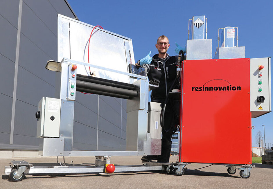 Die Partliner-Dosiertechnik mischt automatisch und im geschlossenen System Partliner-Harz und den jeweiligen Härter homogen und luftfrei, bevor diese über den abnehmbaren Mischkopf in den unter Vakuum gesetzten Folienschlauch mit der Glasfasermatte eingebracht werden. Im Partliner-Vakuum-Imprägnierer wird die Glasfasermatte im Folienschlauch dann unter Vakuum luftfrei imprägniert und gleichmäßig und korrekt kalibiriert.