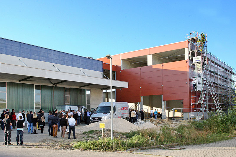 Mit dem Neubau haben wir einen großen Schritt in Richtung Zukunft getan«, sagte EVB BauPunkt Geschäftsführer Gerhard Eberle in einer Festrede vor 130 Gästen. Die Lagerkapazitäten der Kooperation seien endgültig an ihre Grenzen gestoßen, die Möglichkeiten der bisherigen Flächen vollständig ausgereizt. Das neue 12 m hohe und 30 m breite Hochregallager bietet auf 3000 m² rund 5000 Palettenplätze. Auch drei Andockstationen für Lkw werden geschaffen. Zusätzlich verfügt die Halle über ein Gründach und eine Fotovoltaikanlage. Gerhard Eberle: »Der Wettbewerbsvorteil der EVB BauPunkt liegt darin, unseren Kunden Problemlösungen und damit einen Mehrwert zu bieten. Dazu zählen auch Warenverfügbarkeit und Lieferfähigkeit.« Technisch entspricht die neue Halle den Anforderungen an eine moderne Logistik. Die Hochregale werden in Schmalgang-Bauweise errichtet. Zwei zwangsgeführte Stapler – jeder mit einem Gewicht von 10 t – kommen zum Einsatz. Geplant sind auch ein neues Logistikkonzept und ein neues Warenwirtschaftsprogramm. »Wir werden damit in der Lage sein, unsere logistischen Abläufe und Prozesse noch effizienter zu gestalten«, betonte Gerhard Eberle. Ebenfalls auf der Agenda steht der Zusammenschluss der drei EVB BauPunkt-Läger im Gewerbepark Voralb mittels Ringverkehr.