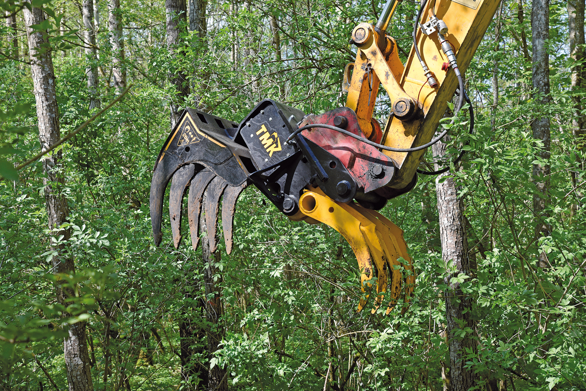 Das Verbindungselement lässt sich hydraulisch sowie elektrisch ansteuern. Die scherenartige Schnittbewegung hinterlässt Herstellerangaben zufolge einen sauberen Schnitt und zieht kein Gestrüpp an den Wurzeln hoch. Auch große Bäume, so Riedelsberger, bleiben fest im Griff an der Basis des Messers, nahe dem Greifer, wo die meiste Klemmkraft entsteht. Der empfohlene Arbeitsdruck der TMK 150 liegt, je nach Zylinder, bei rund 180 bar. Im Baumscheren-Segment finden sich außerdem die Ausführungen TMK 200, 300 und 400 – die Zahlen stehen jeweils für den maximal schneidbaren Baum-Durchmesser. d