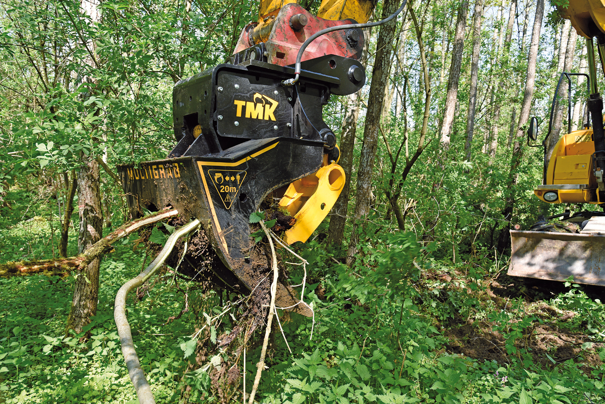 Ein Allrounder, wie er im Buche steht: Der MultiGrab aus dem Hause TMK ist als Abbruch-, Geröll- und Sortiergreifer, aber eben auch als Stubbenzieher und Roderechen entwickelt worden. Ziel war es laut Riedelsberger, ein System zu entwickeln, das speziell für abwechslungsreiche Baggerarbeiten als Mehrzweckanbaugerät fungiert.