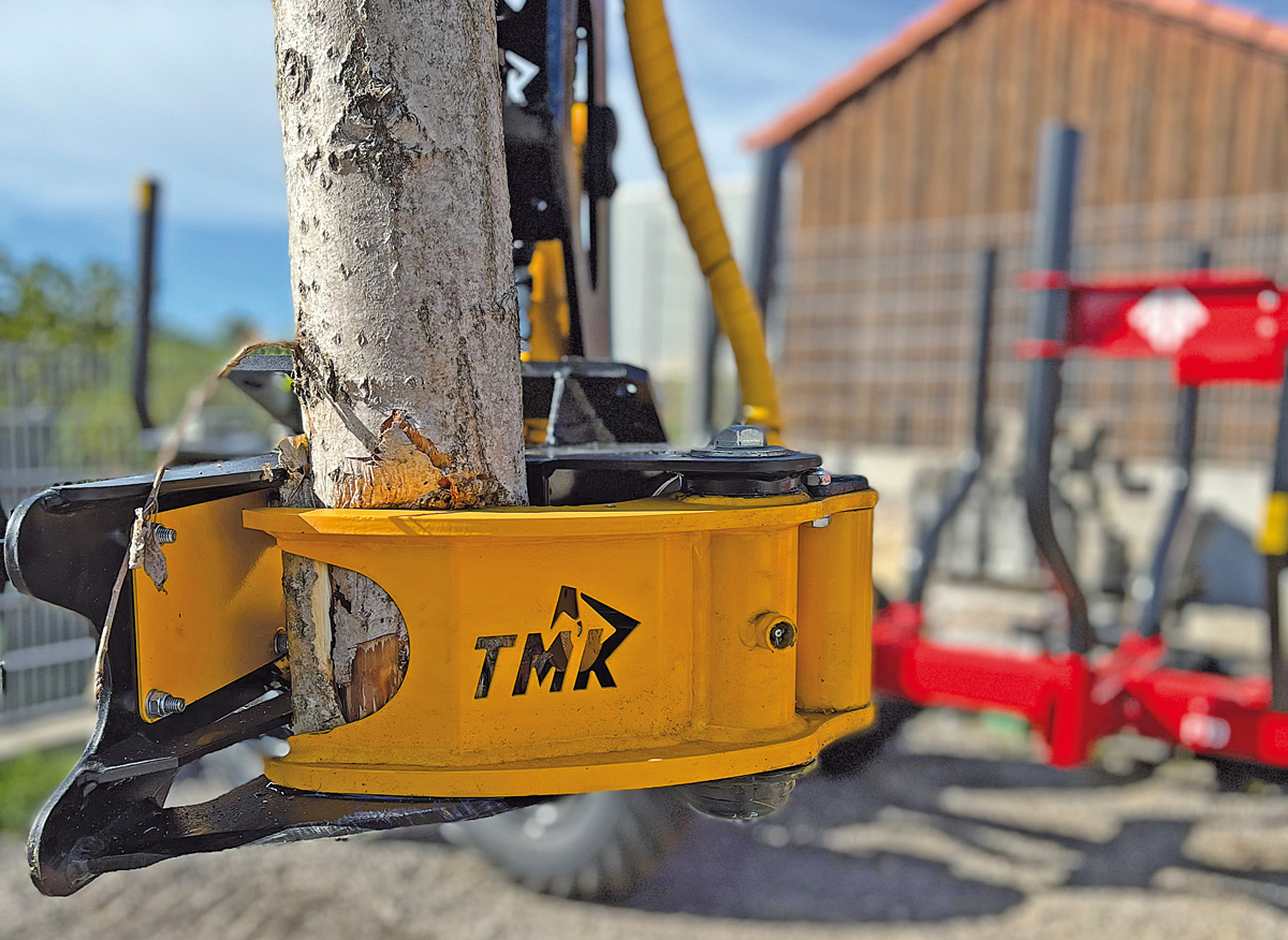Neuester Zuwachs im Produktsortiment von TMK und Riedelsberger ist die rund 75 kg schwere Baumschere TMK 150 – sie wurde für Bagger sowie Krane mit einem Einsatzgewicht von 1 t bis 4 t konzipiert. Gerade bei der Energieholzernte aber auch bei großflächigem Fällen von Waldflächen kommt die TMK 150 zum Einsatz. Dazu gesellen sich Problembaumfällungen, Arbeiten entlang von Verkehrswegen und Trassen sowie die klassische Landschaftspflege. Laut Riedelsberger erweise sich die Baumschere als Kraftpaket: Trotz des vergleichsweise geringen Eigengewichts schneide sie problemlos Bäume mit einem Durchmesser von 150 mm. Als kleinstes Modell der TMK-Serie verfügt die 150er-Ausführung über eine spezielle Kapselstruktur sowie ein starkes Messer, das aus 8 mm dickem Hardox-Stahl gefertigt wurde.