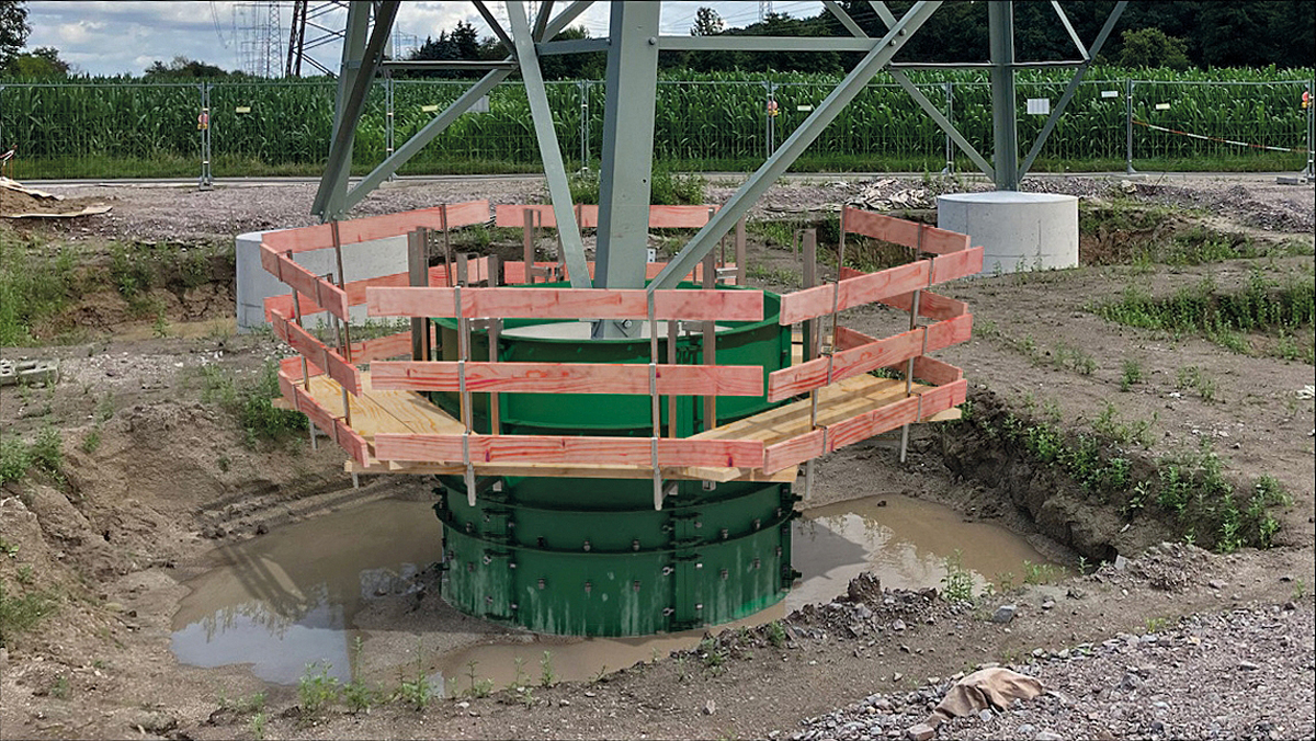 Rundsäulenschalungen in Sondergröße gewährleisten eine präzise und sichere Betonage der Mastfundamente selbst unter anspruchsvollen Bedingungen – wie dem Bau von Stromtrassen über weite Strecken und in unterschiedlichen Geländeprofilen. Die Schalung hat eine Bauhöhe von 2 000 mm und einen Durchmesser von 2 100 mm mit präzisen Längenabstufungen in 50 cm-Schritten und einer maximalen Betondruckfestigkeit von 120 kN/m². Der besondere Kniff: Damit das Einschalen ohne Kran möglich ist, ist die Schalung als Handschalung konzipiert und in sechs Segmente aufgeteilt. So wiegt jedes einzelne Segment nur ca. 40 kg und kann von ein bis zwei Personen getragen werden.