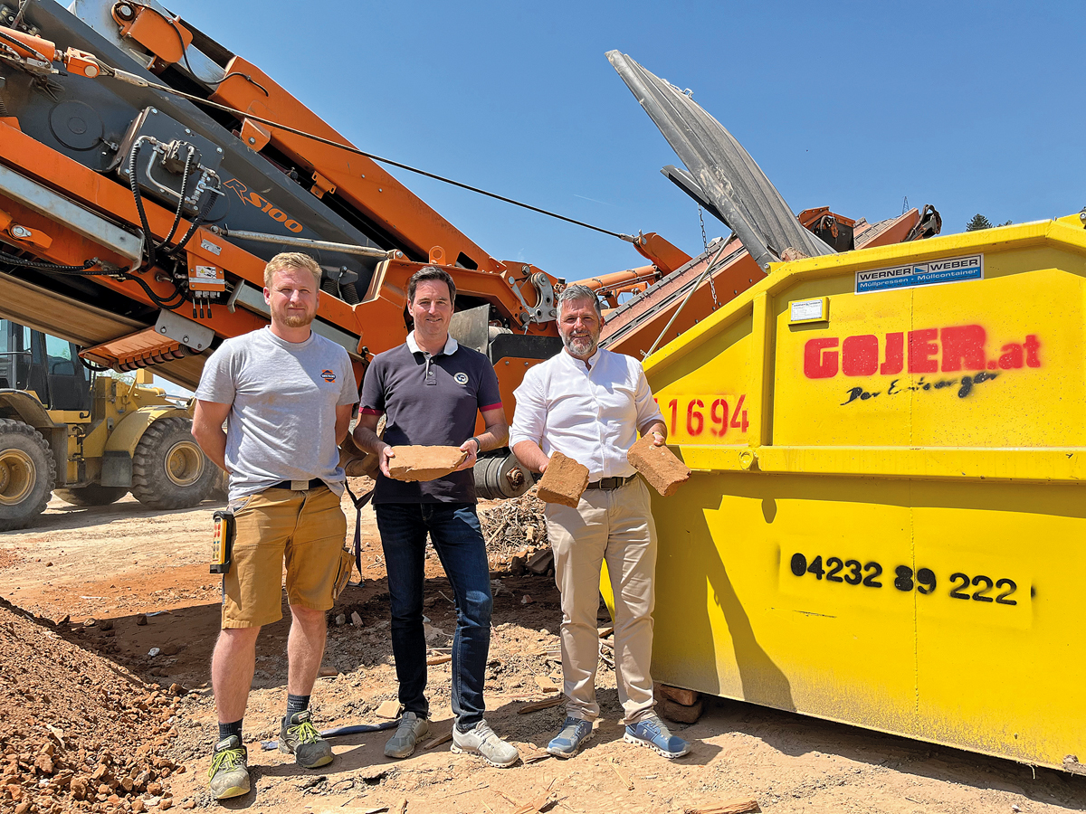 (v. l.): Maschinist Markus Silly, Geschäftsführer Oskar Preinig und Kundenbetreuer Wolfgang Tischler vor ihrem neuen R1000S Prallbrecher.
