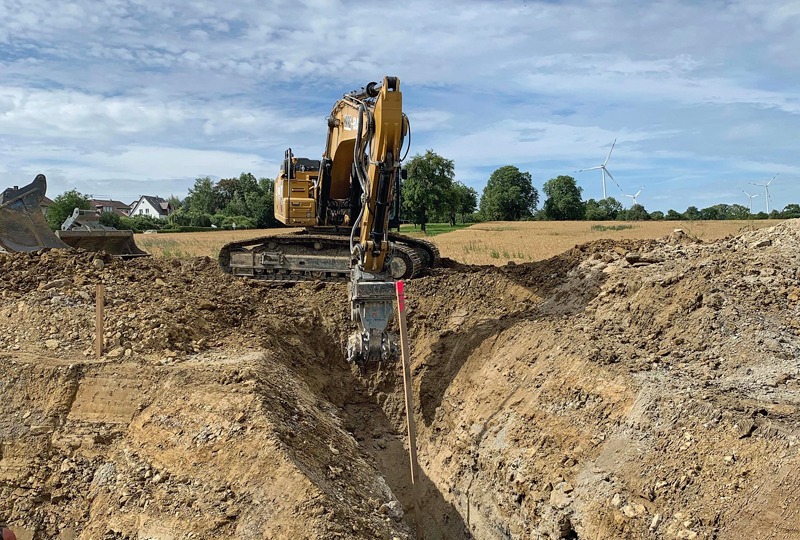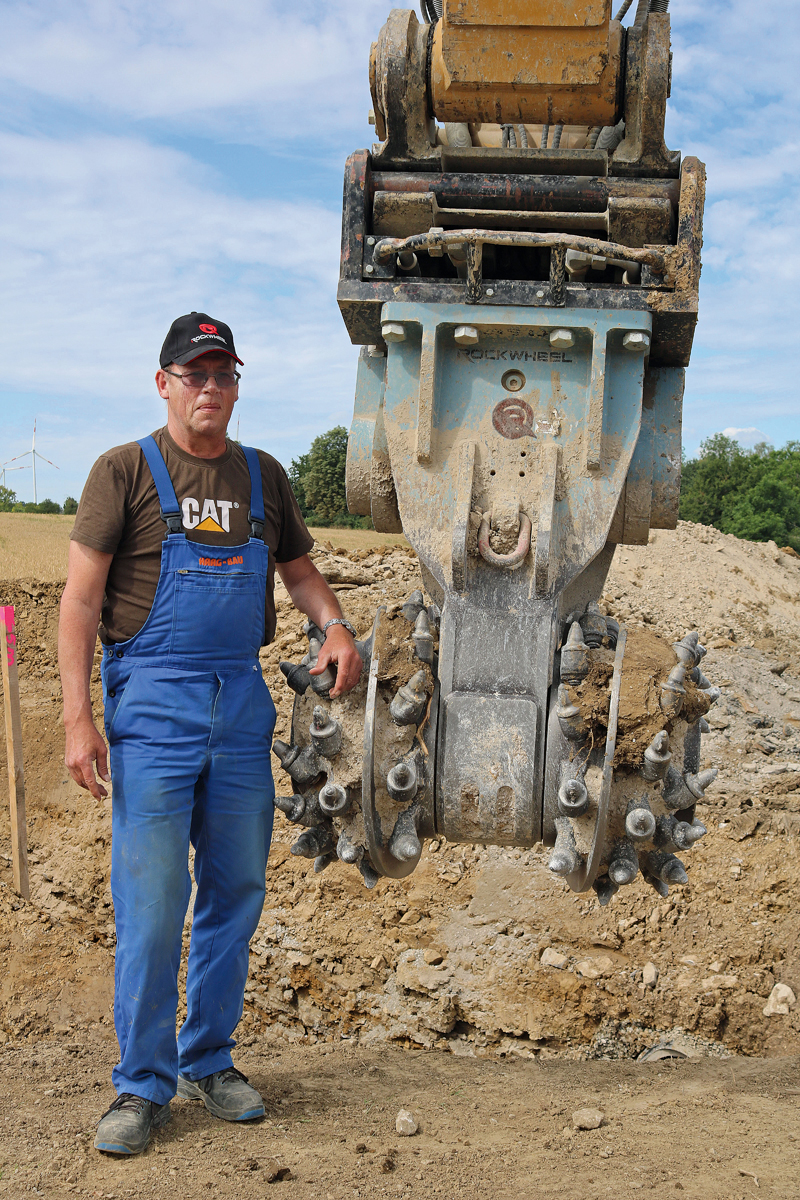 Rund 1,8 ha groß ist das neue Wohngebiet in Kirchberg an der Jagst. Um den Aushub für das Abwassersystem zu meistern, wählte Maschinenführer Krasny eine hydraulische Rockwheel-Anbaufräse G60, mit der sich die Herausforderungen der Bodenbeschaffenheit vor Ort lösen ließen: An der Oberfläche befanden sich Kalkstein und Lehmgemisch, das durch unerwünschte Ausbrüche die Grabenwände verbreiterte. Für den tiefer liegenden Fels war ein Hammer ungeeignet, da er immer zur Grabenmitte abrutschen würde. Die gewünschte Grabenbreite konnte nur mit einer Rockwheel gehalten werden. Das Kalklehmgemisch klebte zu größeren Steinplatten zusammen. Bei der Verwendung eines Hammers oder eines Reißzahns würde oft zu viel Material mit herausgerissen werden. Die Rockwheel-Fräse hingegen schnitt sich durch das Material und garantierte ebenmäßige Seitenwände in Trommelbreite.