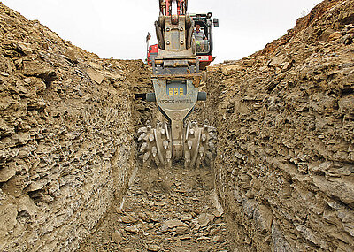 Maschinenführer Jochen Häberle war beeindruckt von der Genauigkeit der Rockwheel Fräse G5. Für Bagger mit 3 - 6 t bringt die Fräse eine optimale Leistung. 22 kW in Kombination mit einer 2:1 Getriebeübersetzung erzeugen maximales Drehmoment und ermöglichen müheloses Arbeiten, auch in sehr hartem Material. Die Schneidetechnik durch die optimale Meißelanordnung und Beschaffenheit ermöglicht Arbeiten ohne Ausbrüche, sodass die Wand ebenmäßig bearbeitet wird.
