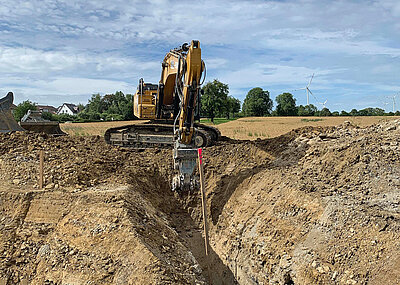Der 5000 qm große Neubau einer Lager- und Produktionshalle in Langenburg bietet neue Kapazitäten. Nachdem die Decke des ebenerdigen Untergeschoss betoniert wurde, folgte der Sockel für das Erdgeschoss. Bei den Betonarbeiten unterlief ein Fehler, sodass der Sockel ca. 4 bis 5 cm überstand, und der Fassadenbauer folglich nicht weiterbauen konnte. Ungenauigkeiten wie diese passieren und müssen möglichst schnell korrigiert werden, um den Bau nicht zu verzögern und die Kosten planmäßig im Rahmen zu halten. Der Übersatz der betonierten Fassade war von Hand nicht zu en[ernen. So war ein Anbaugerät gefordert, welches akkurat Material abträgt ohne die Fassade zu beschädigen.