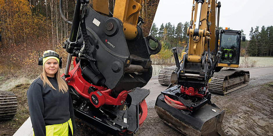 Als junge Frau fällt sie in der Branche zwischen ihren meist männlichen Kollegen natürlich auf. Aber sie stellt auch fest, dass immer mehr Frauen an den Joysticks sitzen. »Absolut. In den sozialen Medien sieht man gut, dass wir immer mehr werden. Das fühlt sich wie eine ganz natürliche Entwicklung an. Ich kann mich nicht daran erinnern, schon einmal schlechter behandelt worden zu sein oder gegen Vorurteile gekämpft haben zu müssen. Ehrlich gesagt kann es von Vorteil sein, Frau zu sein. Außerdem herrscht in der Branche ein größeres Bewusstsein dafür, dass man nicht alle Fahrer – und Fahrerinnen – über einen Kamm scheren sollte. Allein die Tatsache, dass Rototilt seinen neuesten Joystick so entwickelt hat, dass er auch für kleinere Hände geeignet ist, war ein wichtiger Schritt in die richtige Richtung.« Eira war einer der Tester für die RC Joysticks von Rototilt, die für ihr durchdachtes Design ausgezeichnet worden sind. »Von allen Testpersonen hatte ich bestimmt die kleinsten Hände. Daher hoffe ich, dass mein Feedback für mehr Baggerfahrer und -fahrerinnen von Nutzen war. Mit gefällt der Steuerknüppel und wie er in der Hand liegt. Er wirkt vielleicht etwas groß, aber er ist trotzdem gut zu handeln, und ich schätze die Handgelenksstütze. Wenn ich mit dem Löffel eine Böschung bearbeite, benutze ich normalerweise den linken Hebel, aber jetzt konnte ich den Griff loslassen und den Arm einfach nach links wegziehen. Ergonomisch gesehen ein echter Vorteil«, erläutert die Baggerfahrerin.