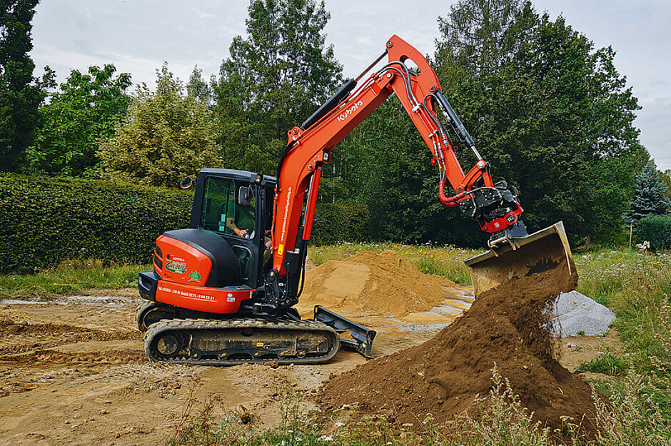 Seit Juli verstärkt der R2 den Maschinenpark des Unternehmens und schon möchten die Mitarbeiter die Neuanschaffung nicht mehr missen. Bei der Gartenumgestaltung mit Bau eines Swimmingpools in Neustadt (Sachsen) etwa ist der Platz so knapp bemessen, dass manche Arbeiten mit einem konventionell ausgestatteten Bagger kaum möglich wären. Hier spielt der Rototilt R2 am Kubota-Bagger KX057-4 seine Stärke aus: »Da ich ihn in alle Richtungen drehen kann, komme ich mit dem Löffel in jede Ecke«, freut sich Maschinenführer Marcel Schröder. Auch sein Chef zeigt sich hoch zufrieden: »Die Mitarbeiter schaffen jetzt deutlich mehr an einem Arbeitstag, weil die lästigen und zeitraubenden Handarbeiten deutlich verringert werden.« Da die Arbeitskraft heute der teuerste Faktor ist, lohne sich die Investition in einen Rototilt schnell. Ein positiver Nebeneffekt sei die gesteigerte Motivation der Baggerfahrer. Helbig plant, auch bei größeren Baggern auf Rototilt zu setzen. »Damit können wir uns noch breiter aufstellen und die Schlagkraft im Bereich Straßenbau erhöhen«, sagt er mit Blick in die Zukunft seines Unternehmens. t