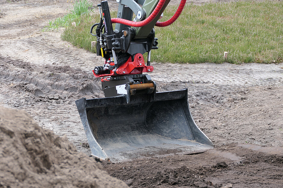 Vor der Bepflanzung steht die Planumerstellung. Dabei kann sich Olesen auf den 2 000-mm-Planierbalken von Rototilt verlassen. Mit ihm ist es leicht, gerade Flächen anzulegen, ohne den Bagger fortwährend umpositionieren zu müssen. Beim Kauf des Schwenkrotators hat er sich zusätzlich für den Planierbalken, den Universallöffel und den Kabellöffel von Rototilt entschieden. Besonders angetan hat es ihm die stufenlos einstellbare Rüttelfunktion, die Teil der ICS-Steuerung ist. »Damit kann ich Kies oder Splitt ganz schnell verteilen«, berichtet er. Auch die Rototilt-Palettengabel hat beim Heben von Material über einen Wall oder eine Hecke bereits gute Dienste geleistet. »Mit dem Radlader hätte ich das nicht geschafft«, sagt Olesen. Zunächst musste sich der GaLaBau-Unternehmer daran gewöhnen, mit dem Rototilt und der Joystick-Steuerung zu arbeiten. Dank ausführlicher Einweisung durch den Rototilt-Service sei er schnell sicher im Umgang mit der Technik geworden und möchte sie nicht mehr missen. »Wenn ich den Minibagger steuere, der nicht mit einem Schwenkrotator ausgestattet ist, fehlt mir etwas«, berichtet er. Um auf GaLaBau-Projekte jeder Größe vorbereitet zu sein, steht in naher Zukunft die Anschaffung eines 2,5-t-Baggers an. »Selbstverständlich wird er wieder mit einem Rototilt ausgerüstet«, lässt Olesen keinen Zweifel zu. t