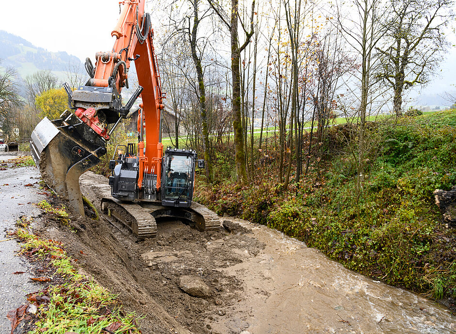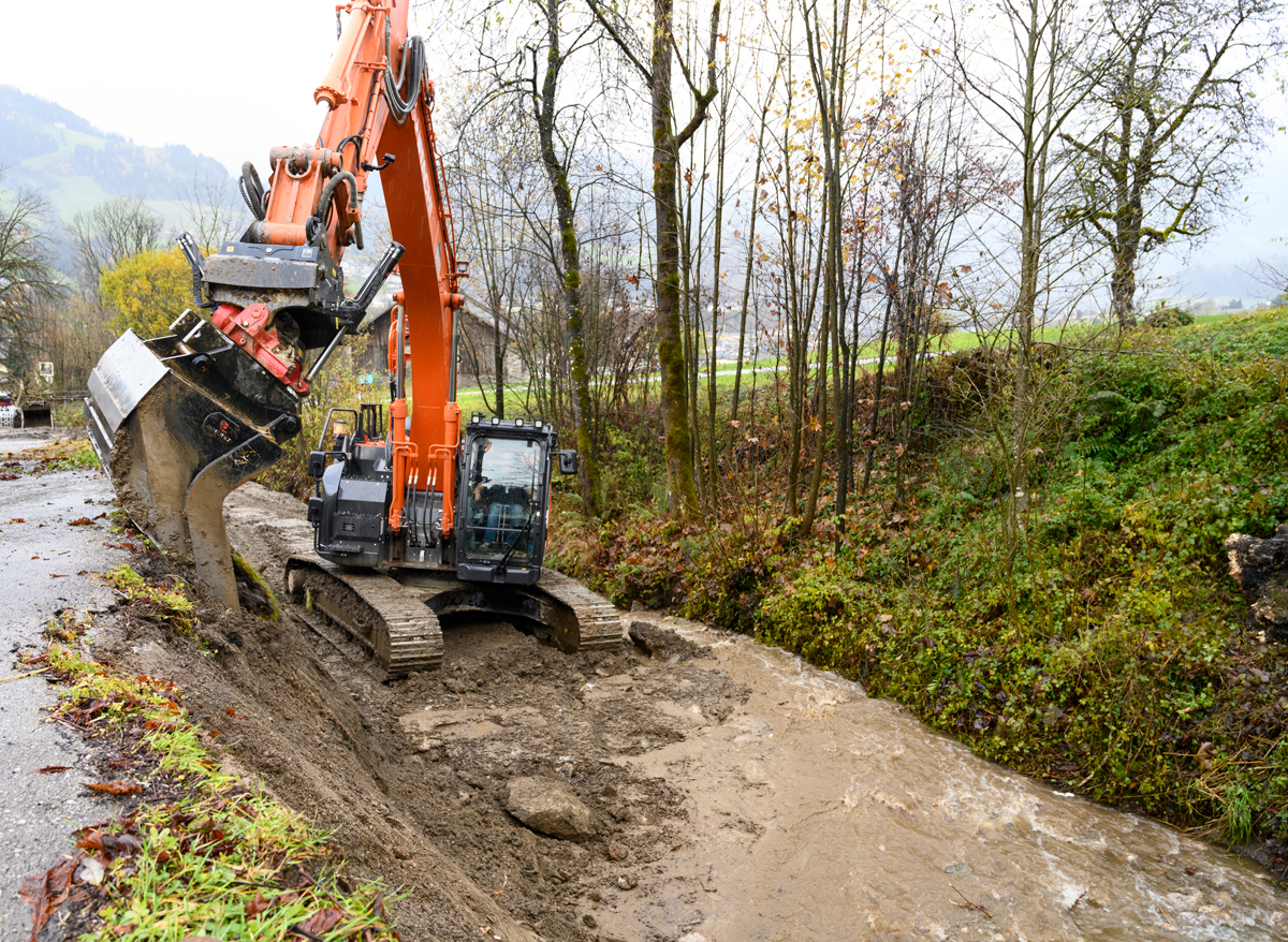 Grubers aktueller Einsatzort befindet sich in einem Bachbett in St. Johann im Pongau, wo er mit seinem Hitachi-Kettenbagger ZX225 das Bett verbreitert und das Ufer stabilisiert. Gezielt versetzt er mithilfe des Tieflöffels einen gut 1 m3 großen Felsbrocken. Dieser fungiert im fließenden Bach als temporäres Stauwehr, um Beton punktgenau und materialschonend einsetzen zu können. Dass sich der Findling so präzise wie mit der Hand versetzen lässt und die Böschung so feinfühlig bearbeitet werden kann, ist der Ausstattung des Baggers zu verdanken. Ausgerüstet ist er mit einem Sandwich aus Rototilt QuickChange MCQC70-55 und QC70-55 am Tiltrotator R6. »Es ist eine große Erleichterung, den Bagger bei Baustellen mit wenig Platz und eingeschränkter Sicht seltener neupositionieren zu müssen«, nennt Gruber einen Grund, warum sich das Unternehmen 2011 für Systeme von Rototilt entschieden hat. Zudem gehe die Arbeit effizienter, materialsparender und schneller vonstatten und letztlich sei es auch deutlich einfacher, Preise bei Ausschreibungen zu kalkulieren.