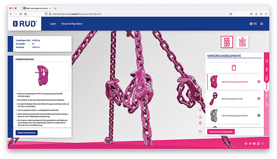 RUD gilt mit mehr als 140-jähriger Firmengeschichte als internationaler Experte für Anschlag- und Hebetechnologie. Der neue Anschlagmittelkonfigurator soll auf dem Expertenwissen aufbauen und dabei den Anwender Schritt für Schritt durch die einzelnen Ebenen der Konfiguration führen. In einem Informationsblock kann der User dabei wichtige Informationen und Tipps zum Auslegen eines Kettengehänges einholen. »Uns war wichtig, dass auch im Thema weniger Versierte innerhalb kürzester Zeit erfahren, welche Funktionen die einzelnen Gehängekomponenten haben, worauf es bei der Konfiguration ankommt und auf was sie achten müssen«, so Jürgen Grubmüller weiter.