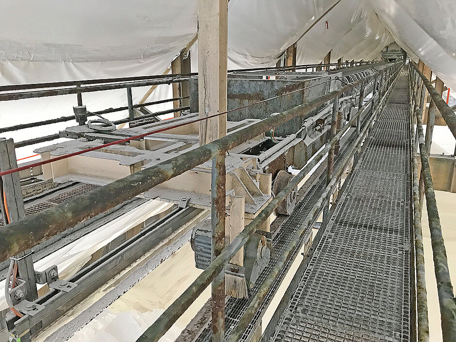 »Vorher lief unser verfahrbarer Bandabsetzer per Direktantrieb der Räder über einen Getriebemotor und eine Rollenkette. Doch mit dem Salz und der Feuchtigkeit in der unbeheizten Lagerhalle sind die Räder auf den Laufschienen immer wieder durchgerutscht oder verblockt. Mindestens einmal pro Woche fiel das System aus und ein Mitarbeiter musste den Bandabsetzer per Kettenzug ziehen. Ein Umbau der Anlage war unausweichlich«, schildert Alexander Gils die Problematik. In der Halle in Borth können ca. 70 000 t Salz zwischengelagert werden. Die Bandanlage befindet sich in einer Höhe von 20,7 m und hat einen rund 70 m langen Fahrweg. Mit einer Förderkapazität von 500 t/h schlägt sie innerhalb eines Jahres rund 1 Mio. t Salz um, was rund 37 000 Lkw-Ladungen entspricht. Eine hohe Anlagenverfügbarkeit ist daher essenziell. Für eine optimierte Prozesssicherheit sollte das neue Antriebssystem des Bandabsetzers vor allem robust gegen Salz und Feuchtigkeit sein. Fündig wurde Alexander Gils bei RUD und dessen Tecdos Produkten. Das Prinzip des Tecdos Antriebssystems, das an der Bandanlage in Borth im Einsatz ist, soll dabei so simpel wie revolutionär sein: Der Antrieb ist am SEW-Motor der Anlage befestigt und zieht sich an der horizontal gespannten Tecdos Rundstahlkette über den gesamten Fahrweg von rund 70 m entlang. So bewegt er den Bandabsetzer vor und zurück.d