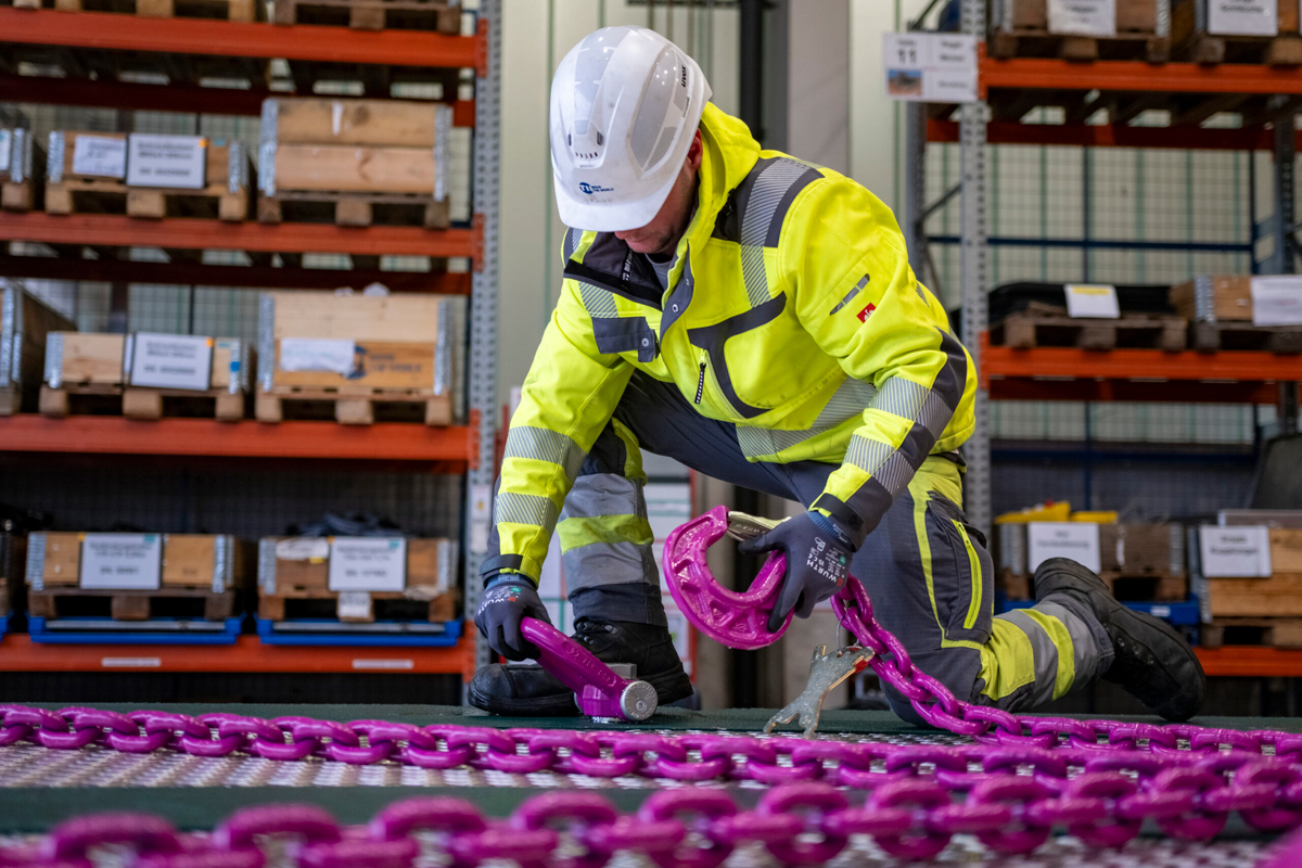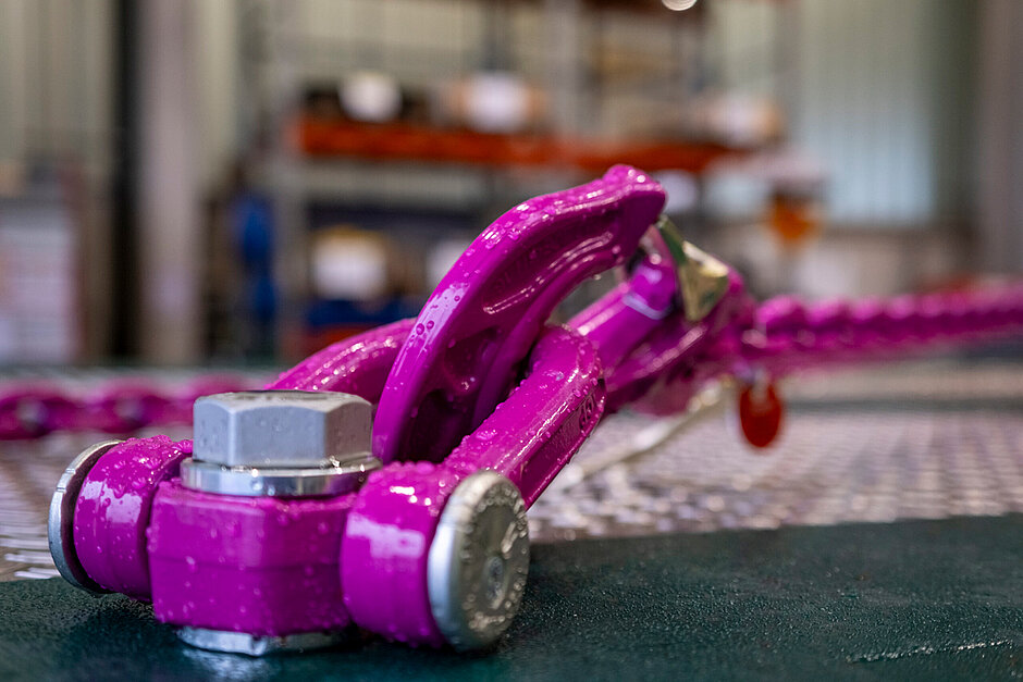 So ist die Belastbarkeit des ACP-Turnado nach Angaben von RUD etwa 30 Prozent höher als bei Zurrpunkten vergleichbarer Größenordnung. Gefertigt aus hochfestem Stahl und ursprünglich insbesondere als Anschlagpunkt für das Heben schwerer Lasten konzipiert, ist er deshalb auch zur Sicherung schwerer Lasten optimal geeignet. Zudem erweist sich der zentrale technische Clou des ACP-Turnado – die integrierte Federmechanik, die beim Anheben dafür sorgt, dass sich der Bügel stets in Zugrichtung ausrichtet – auch beim Verzurren von Transportlasten als Vorteil, wie Alborn betont: „Diese Selbstausrichtung nehmen wir gerne mit“. Kombiniert werden die Zurrpunkte bei der Ladungssicherung mit RUD ICE Zurrketten der Güteklasse 12 mit einer Lashing Capacity von 25.000 daN.