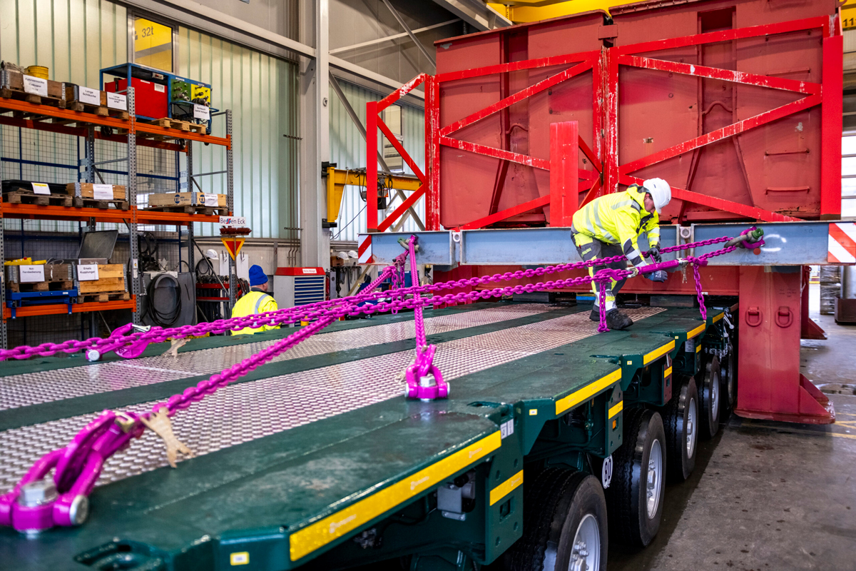 Ein weiteres Argument zugunsten des ACP-Turnado war für Alborn die hohe Flexibilität, die er parallel zu seiner hohen Belastbarkeit bietet. Als schraubbarer Zurrpunkt ist er in seiner Position niemals festgelegt, sondern kann grundsätzlich beliebig versetzt werden. Um diesen Vorteil voll ausschöpfen zu können, muss der Rahmen des Schwerlastmoduls jedoch nicht nur hinreichend viele Durchgangsbohrungen, sondern auch die nötige Festigkeit aufweisen. In enger Abstimmung mit RUD passte TII Scheuerle das Rahmendesign deshalb individuell an und stellte so sicher, dass alle Voraussetzungen für eine hochstabile Befestigung der Zurrpunkte gegeben waren.