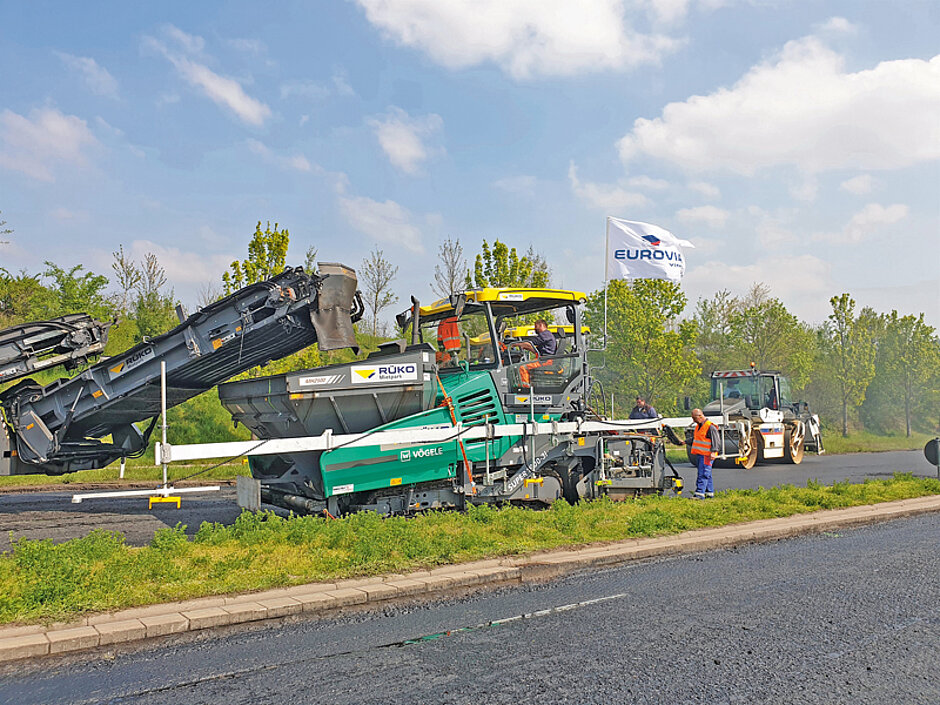 Für Eurovia im Einsatz waren zwei Vögele-Fertiger der Typen Super 1800-3i und 1900-3i mit einer benötigten Einbaubreite von 3 m mit zusätzlichen Big-Sonic-Ski und Kübel, ein Dynapac-Offsetbeschicker (Modell MF 2500 CS) sowie zudem zwei Tandemwalzen von Bomag (BW 174) und eine BW 154-Bomag-Kombiwalze – zwei davon mit Asphalt-Manager. Der Beschicker und die Kombiwalze wurden jeweils mit Bedienpersonal angemietet.