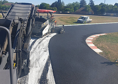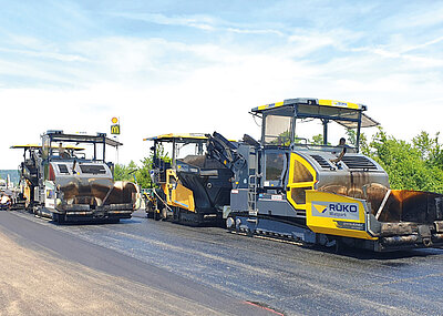 Anfang Mai starteten die Fräsarbeiten in der Nähe des Ötztaler Bahnhofs auf einer Länge von mehr als 1,3 km. Hierbei wurden die obersten Asphaltschichten abgetragen und im nächsten Schritt eine Profilierung mit AC16 vorgenommen. Im Anschluss wurden mit einem Vögele-Fertiger des Typs Super 1803-2 die neuen Asphaltschichten eingebaut. Um einen kontinuierlichen und erschütterungsfreien Einbau des angelieferten Asphalts zu gewährleisten, kam zusätzlich ein Dynapac-Beschicker MF 2500 CS zum Einsatz. Für die gesamte neue Asphaltfläche von mehr als 10 800 m2 wurde SMA11-Asphalt für die Binder- und Deckschicht verwendet.