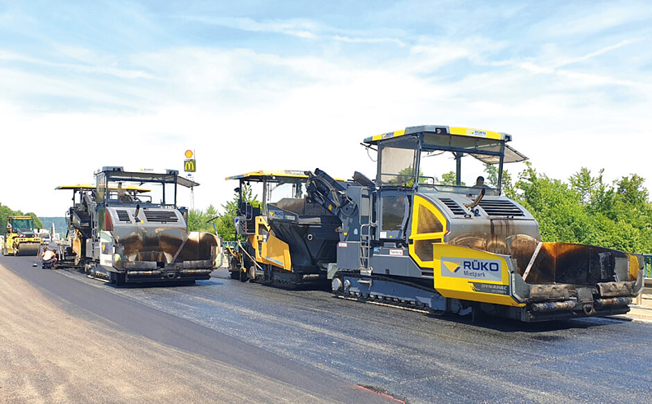 Trotz der breiten Lutzenberger-Baumaschinengrundausstattung mussten zur Bewältigung des Bauvorhabens unterstützend externe Asphaltmaschinen angemietet werden. Wegen guter Erfahrungen mit dem Malscher Baumaschinenvermieter RÜKO war eine Kooperation für dieses Projekt naheliegend. So konnte RÜKO mit einem Dynapac-Beschicker MF 2500 CS mit Schwenkband (inklusive Fahrer) und einer Bomag-Walze aushelfen.