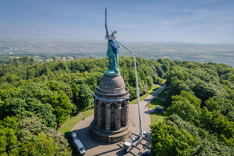 Der Einsatz in luftiger Höhe verlangte präzise Planung und maximale Leistung, wie Ruthmann berichtet. Mit 57 m Arbeitshöhe, bis zu 41 m Reichweite und einer Korblast von 600 kg bot der Ruthmann Steiger T 570 HF die geeigneten Voraussetzungen, um das 9 m hohe und 7,2 m breite Trikot sicher und effizient am höchsten Denkmal Deutschlands zu befestigen. Das Trikot wurde aus rund 130 m2 Fahnenstoff gefertigt und mithilfe der Ruthmann Highflex-Arbeitsbühne fachgerecht installiert.