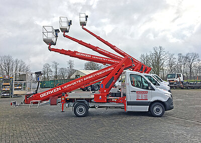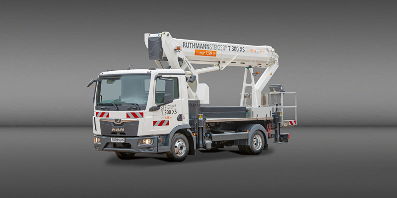 Auch beim Steiger T 300 XS setzt Ruthmann auf das Multi-Chassis-Konzept. Die Hubarbeitsbühne kann auf 7,49-t- bis 8,6-t-Fahrgestelle der Hersteller Mercedes-Benz, MAN oder Iveco aufgebaut werden. t